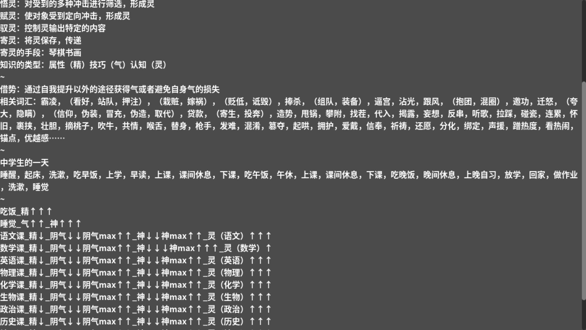 软件内容为纯文字,包含精气神灵的基础概念,延伸概念,与“气”相关的重要概念“借势”的解释及相关词汇,以及中学生的日常从精气神灵角度的分析