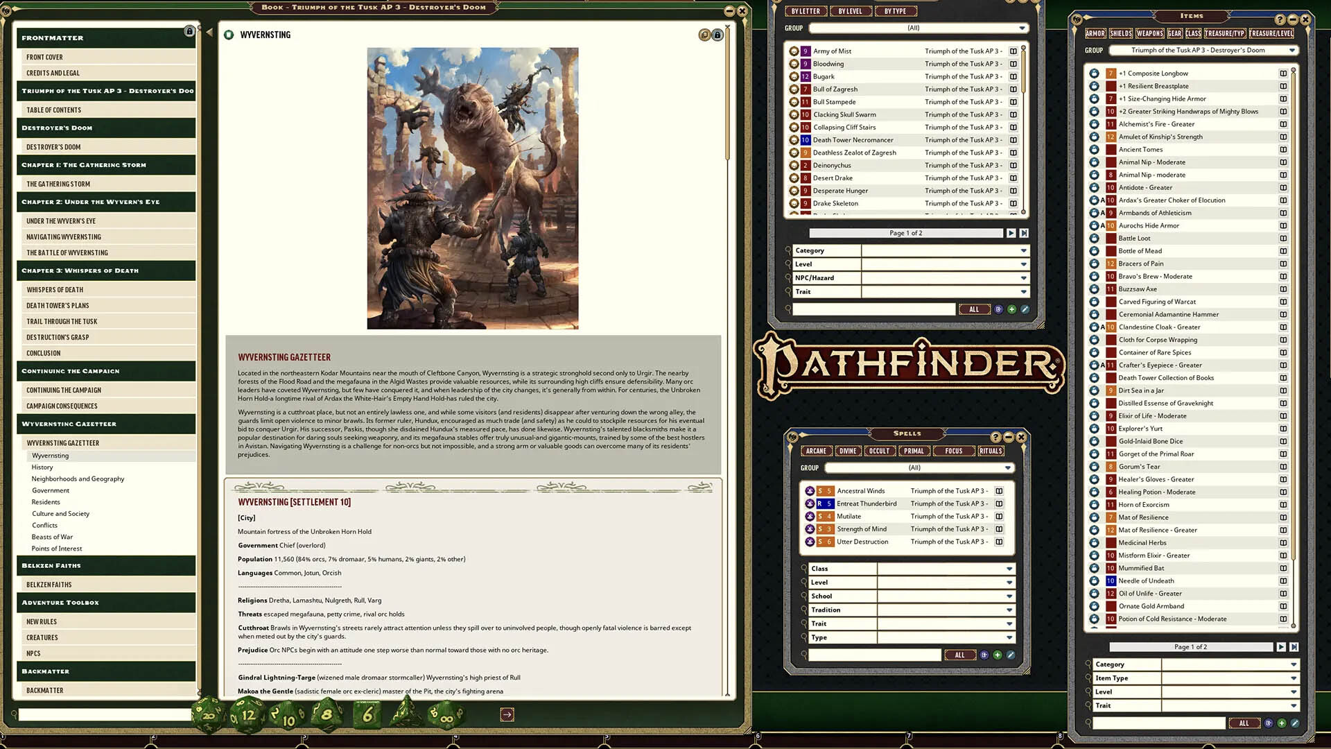 Destroyer's Doom is an orc-focused Pathfinder adventure for four 9th-level characters. The adventure concludes the Triumph of the Tusk Adventure Path, a three-part monthly campaign in which an eclectic band of dignitaries become battle-hardened survivalists fighting for orcs' homeland and independence. This volume includes opportunities to continue the adventure, an exploration of orc faiths, a gazetteer of the treacherous city of Wyvernsting, new magic items, and an assortment of new creatures that haunt Belkzen's mountains and silt seas.