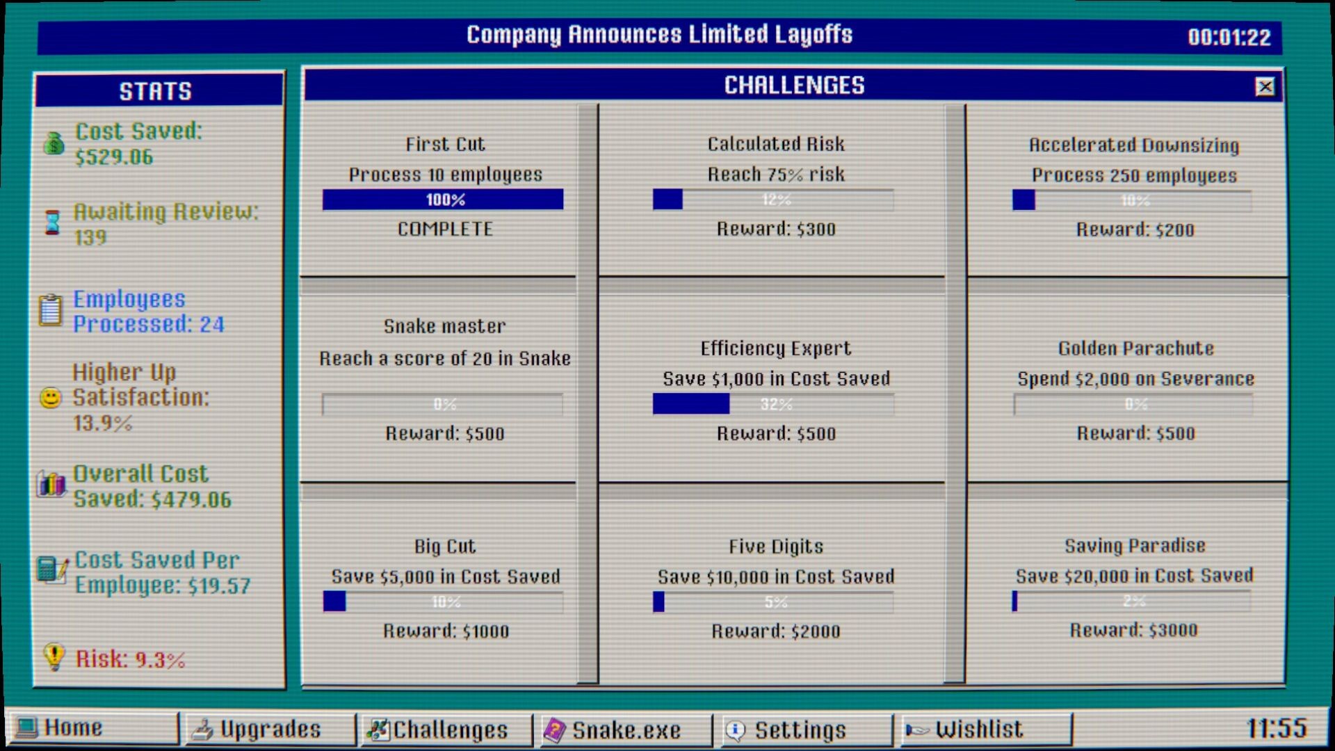 Maximize profit. Minimize humanity. In Downsizing.exe, you are a cog in the dark corporate machine. Approve terminations, automate the grind, and slash costs. How much will you sacrifice for the firm?