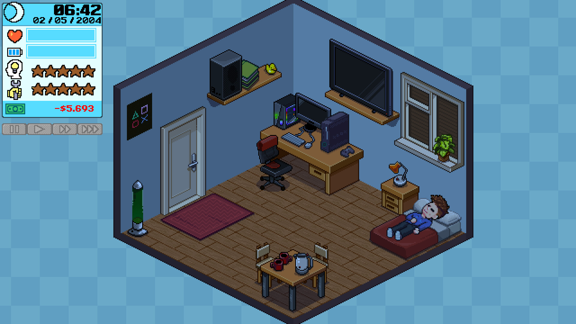 • You can purchase better furniture for your room (e.g. PCs, consoles...), but be careful with your expenses to avoid getting in debt.