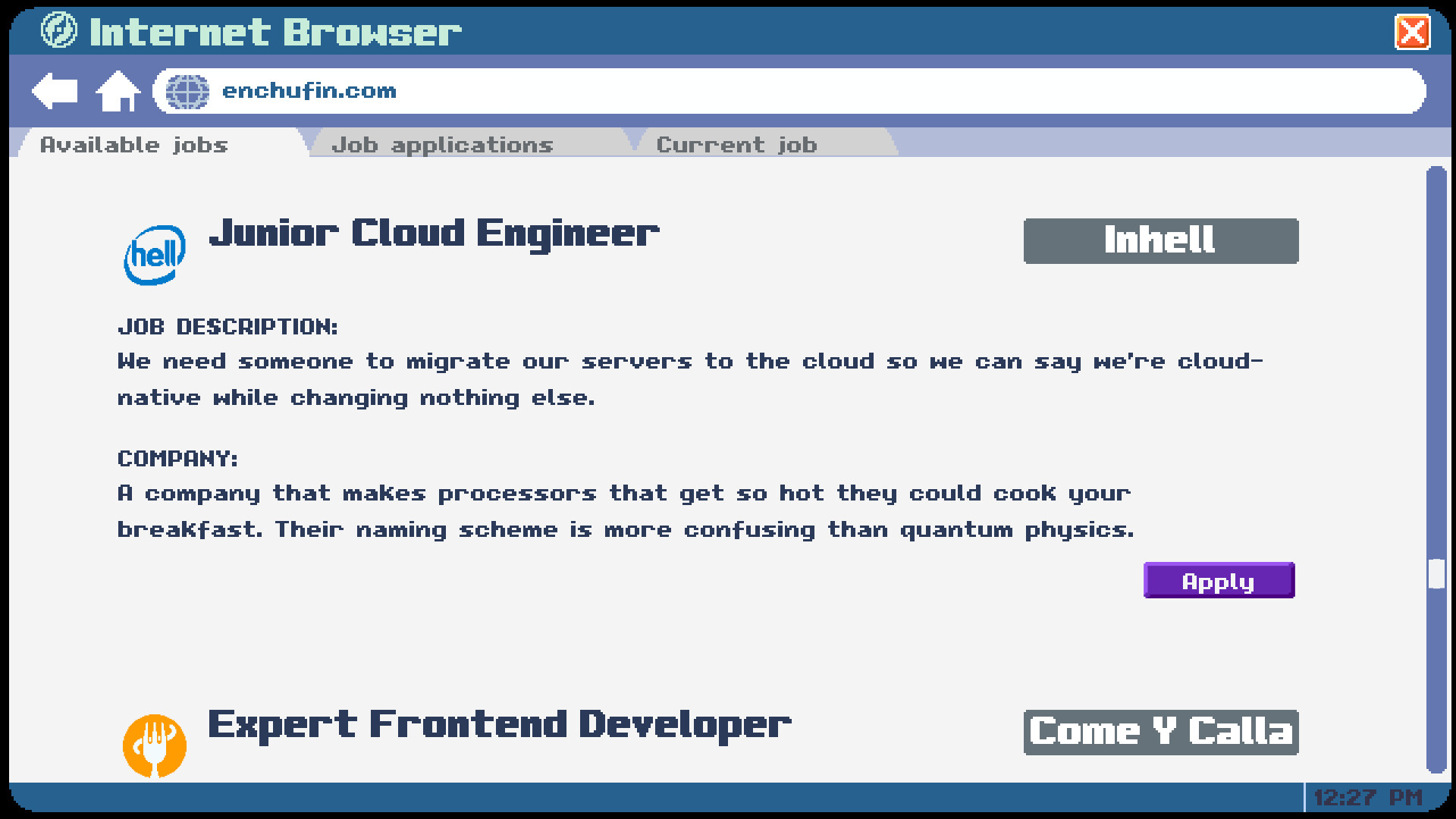 영혼을 쪽쪽 빨아먹는 기업들이 지배하는 세계에서 전도유망한 소프트웨어 개발자의 삶을 살아보세요. 주인공이 업계에서 커리어를 만들어 나가며 인생 목표를 달성할지, 아니면 그전에 번아웃으로 쓰러질지는 당신의 손에 달려 있습니다.