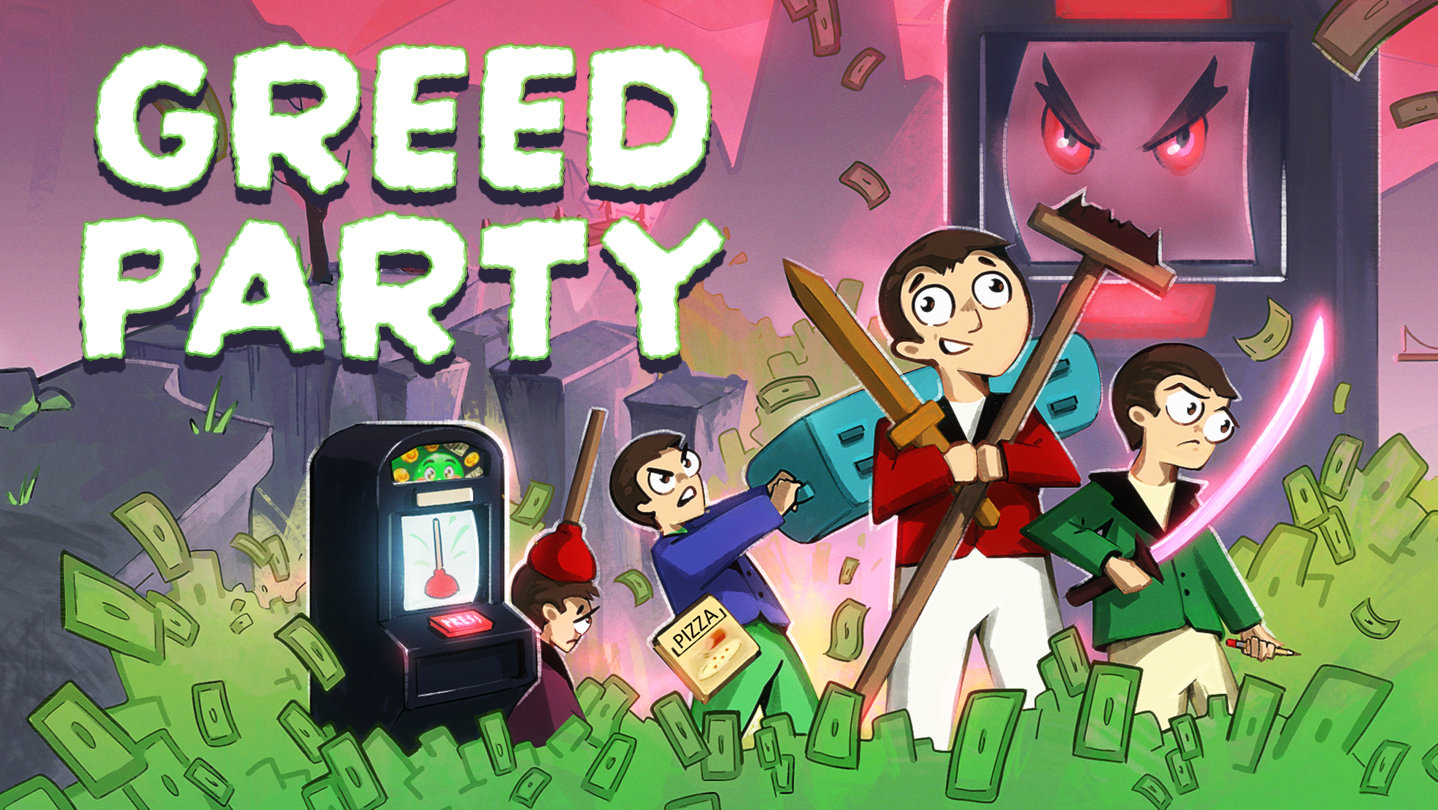 A co-op party game where you collect coins, gamble for weapons in slot machines, and fight a boss together in a cursed world of greed.