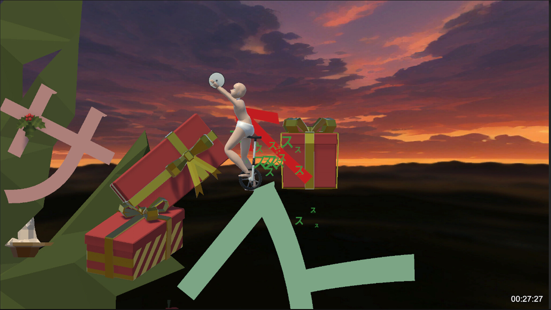 "two-wheeled-man" is a punishing action game where you climb massive KATAKANA characters placed throughout the stage and aim for the summit.
