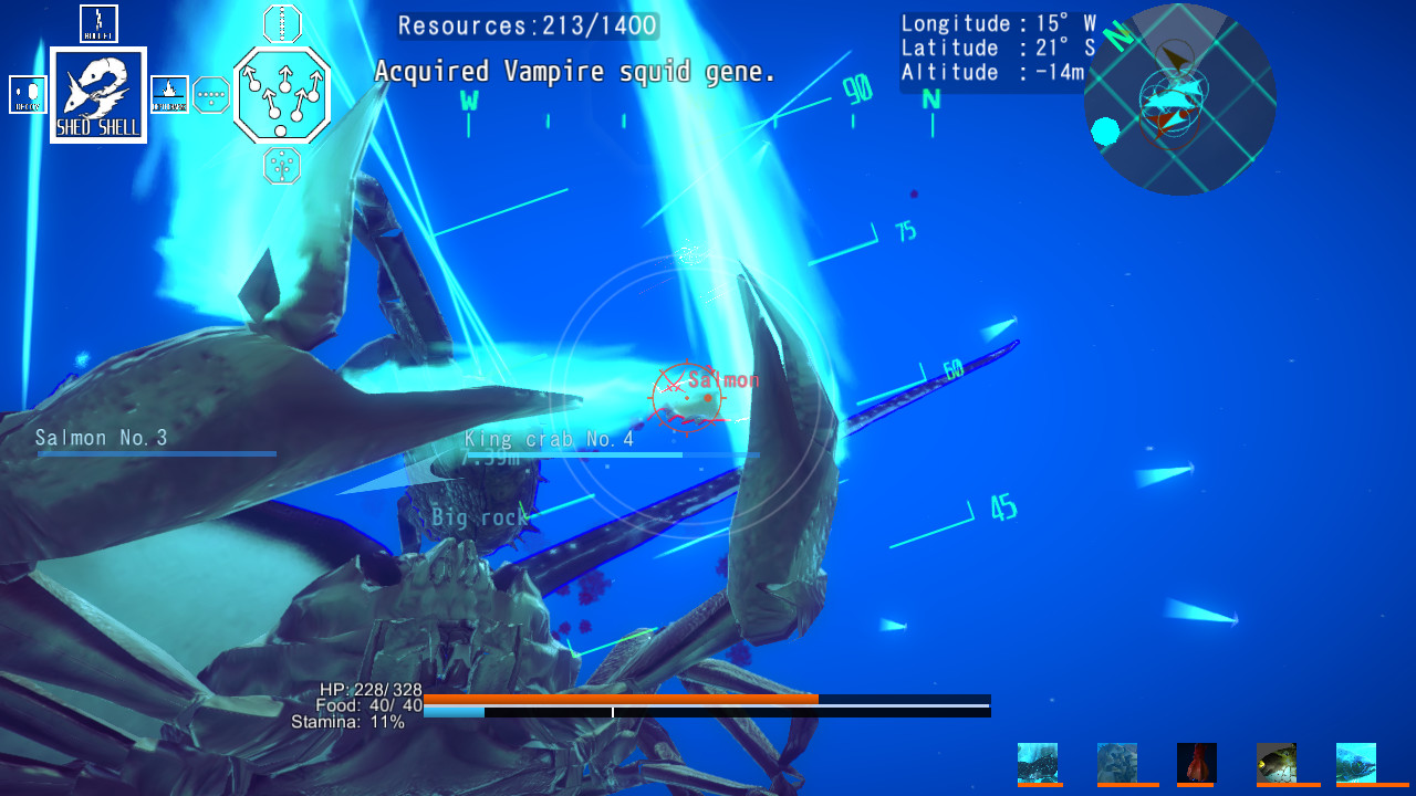 Ace of Seafood is a third-person action game in which you establish a party of up to six fish/crustaceans, exploring the vast ocean and battling with various forms of marine life in order to expand your oceanic domain.