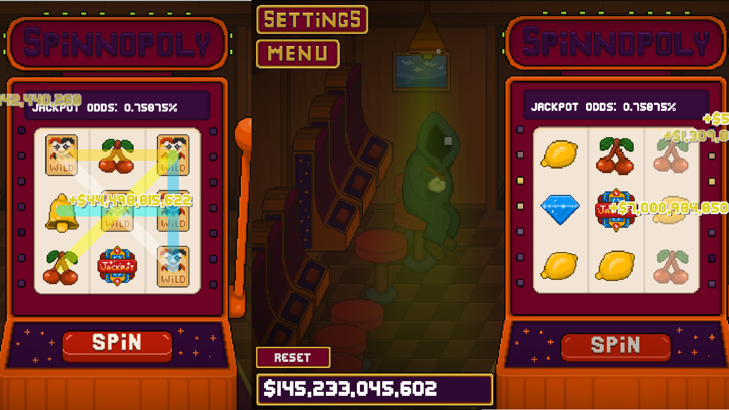 Spinnopoly is a short incremental clicker about a gambling addict’s desperate attempt to escape a rigged purgatory. The game practices true randomness. Starting with a 1 in 178 billion chance of a jackpot the odds are effectively impossible. In this strange space your luck is at absolute zero.