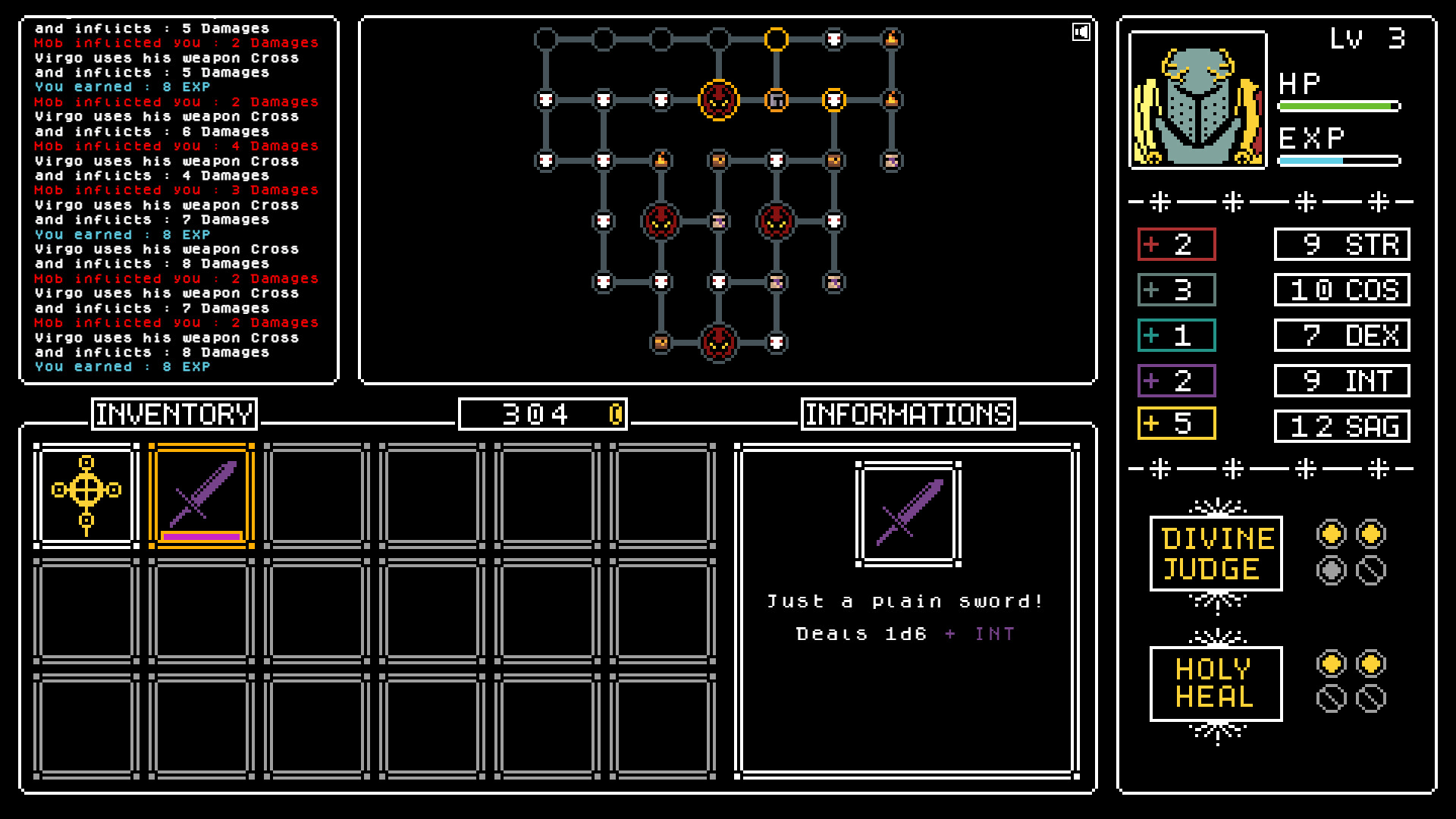 This is the game world and the interface that will guide you throughout your entire adventure in the dungeon. You can check your health, experience bar, hero stats, abilities, and the number of available action slots on the right side of the screen!