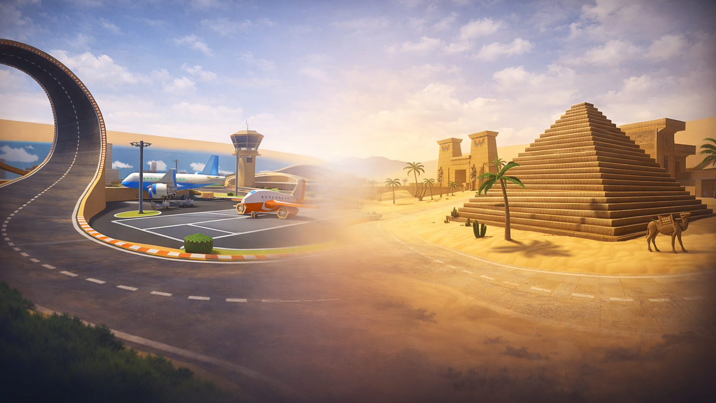 From taped edges to layered textures, each environment brings a playful yet detailed racing experience.