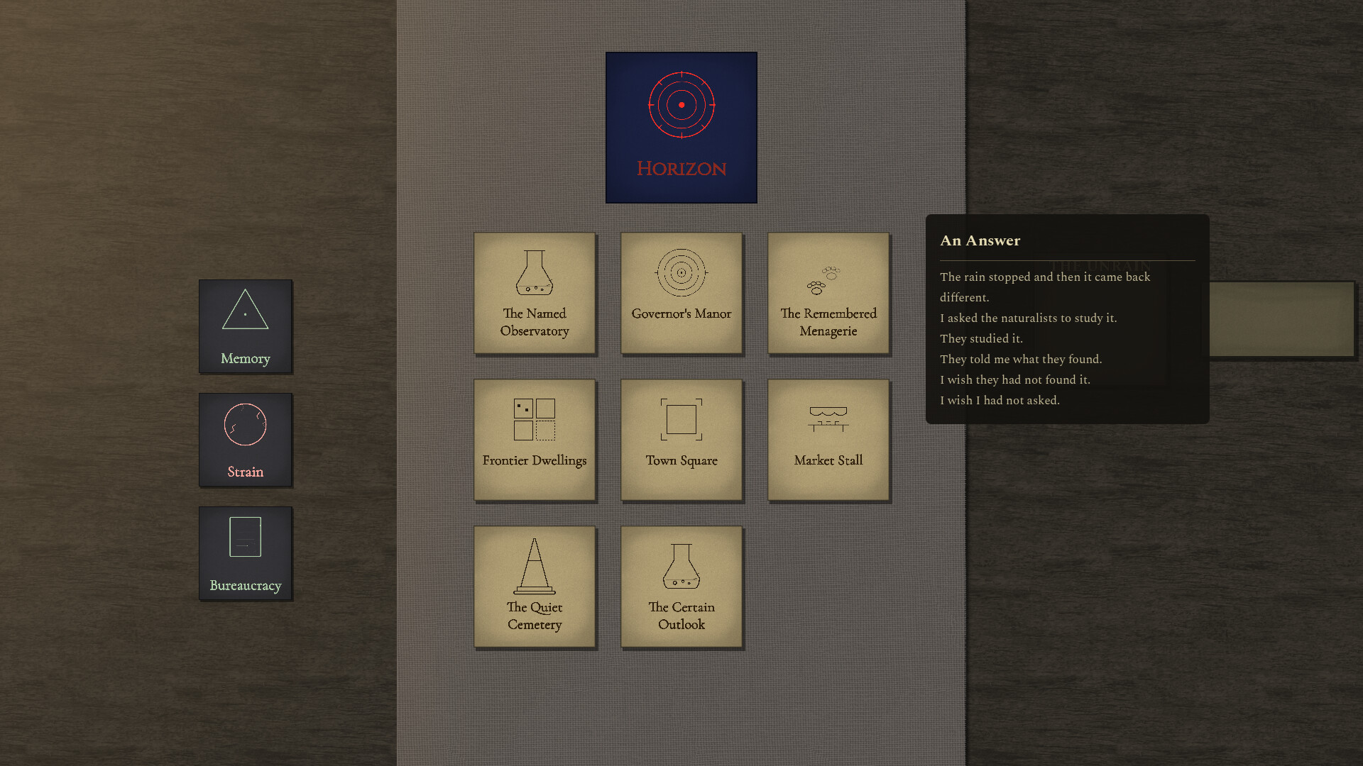 The Horizon takes every settlement eventually. That is what it does. That is what it has always done. But something persists — a name you chose once, surfacing in a stranger's mouth. A branch you closed, gleaming on the path you didn't take. An echo from a settlement that ended, leaking back across the boundary. 24 story arcs. Over 120 possible endings. You will see four in a run. Each time you return you carry something the frontier left in you. Perhaps this time you will understand what the Horizon wants. Perhaps this time you will find the thing that makes it stop. The Bureau has its doubts. It has filed them accordingly.