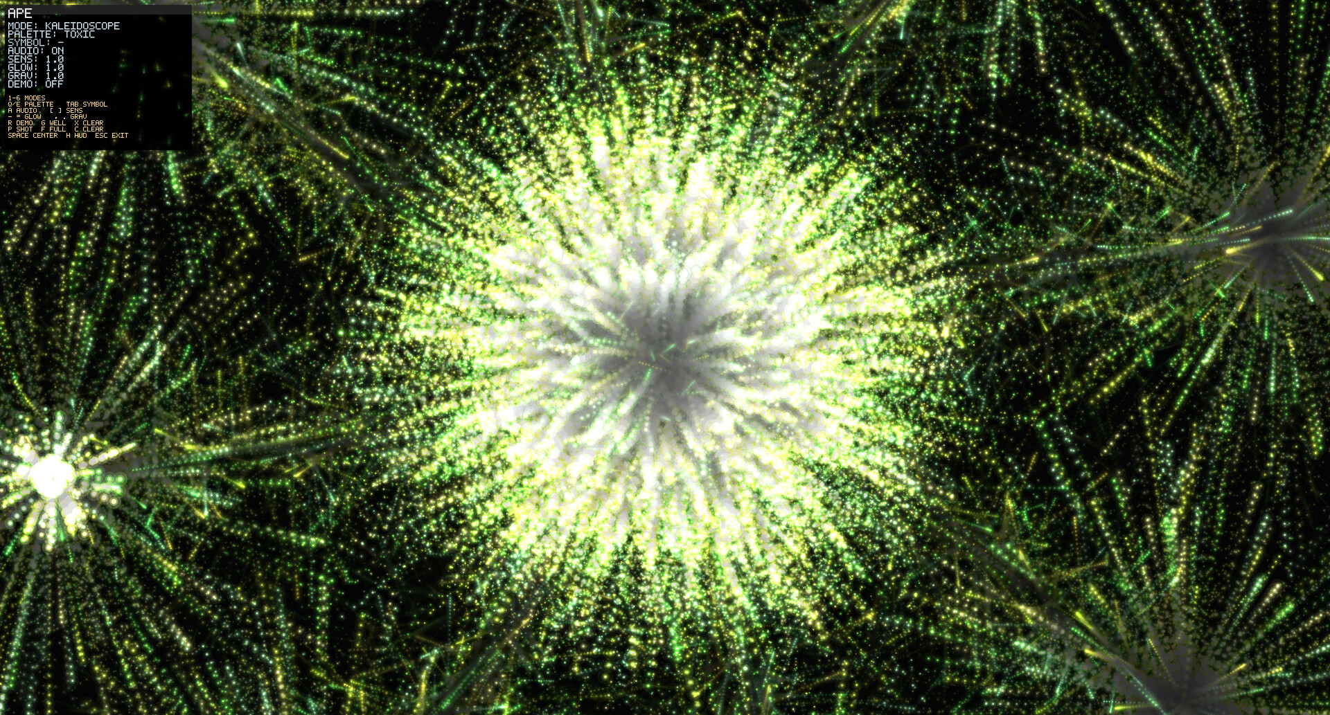 Whether you want to explore generative visuals, experiment with interactive effects, or simply relax while watching particles dance to music, APE offers a lightweight and endlessly variable visual playground.