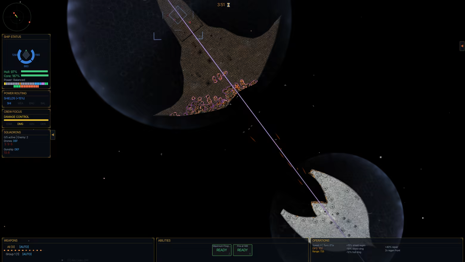 -Capital ship combat with directional shields, functional hull armor that erodes visibly through battle, weapon arcs, fighter bays, torpedoes, point defense, and multi-wave encounters