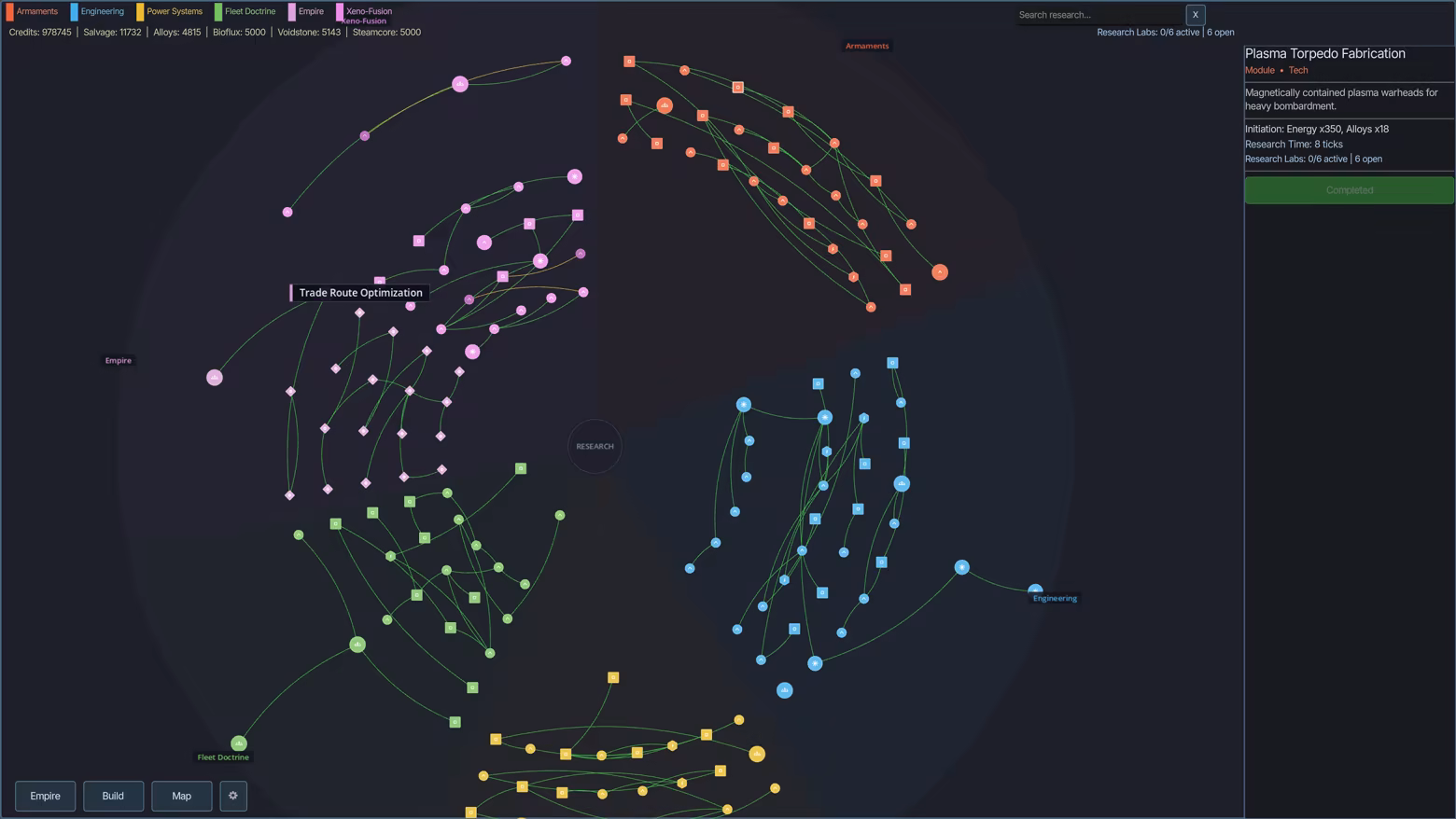 -Tech tree with 5 faction branches, economy bonuses, and cross-faction synergy techs