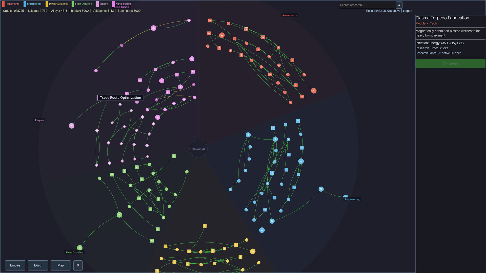 -Tech tree with 5 faction branches, economy bonuses, and cross-faction synergy techs