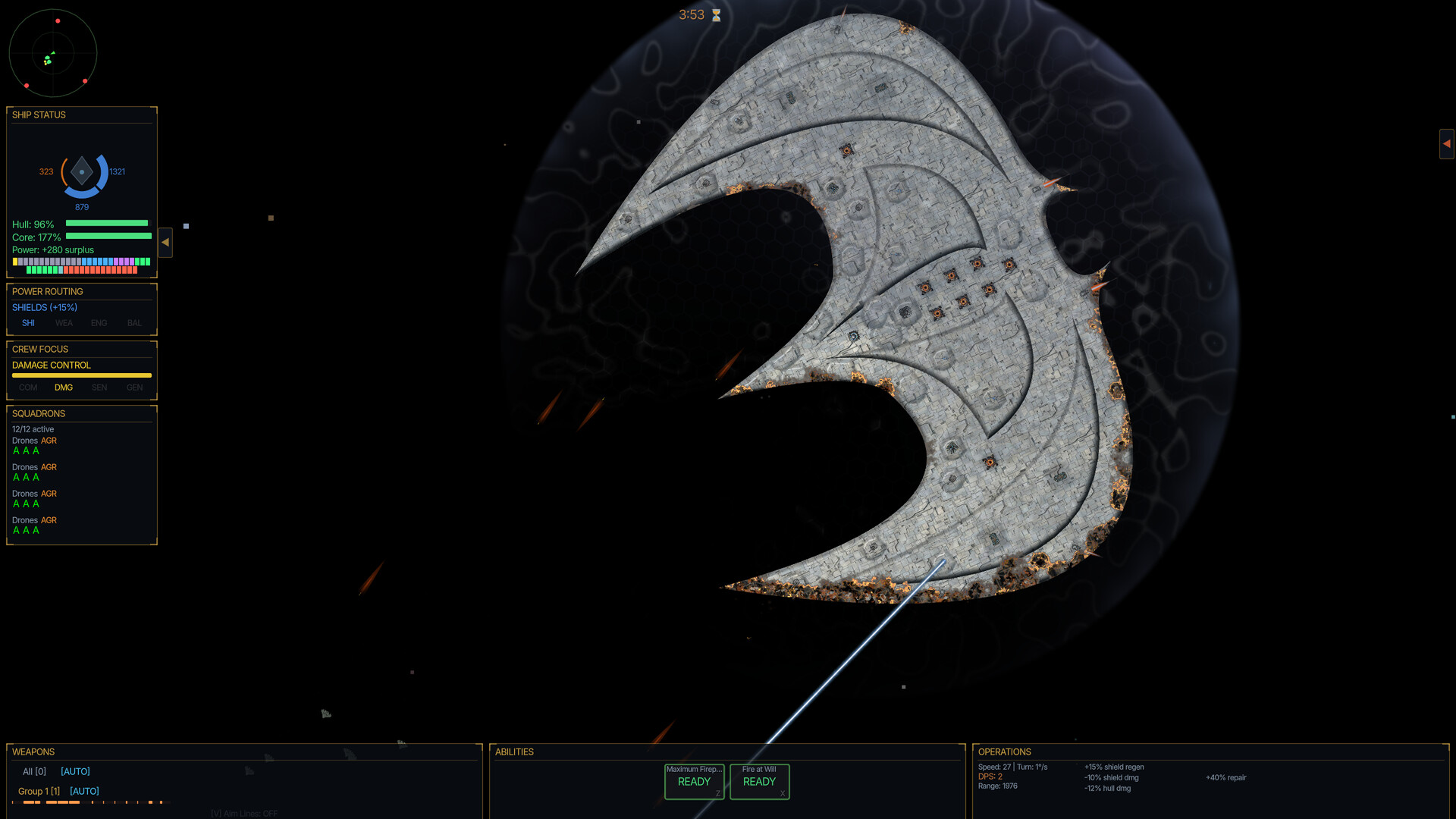 -Capital ship combat with directional shields, functional hull armor that erodes visibly through battle, weapon arcs, fighter bays, torpedoes, point defense, and multi-wave encounters