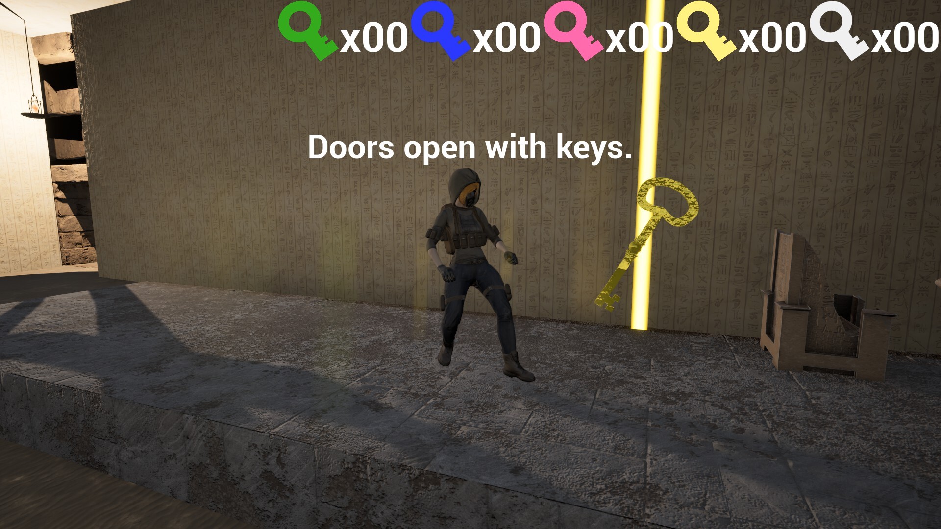 A surreal desert-and-pyramid setting, straightforward rules with colored keys and doors, and light beams that help you locate keys—clear systems so you can focus on the maze and exploration.