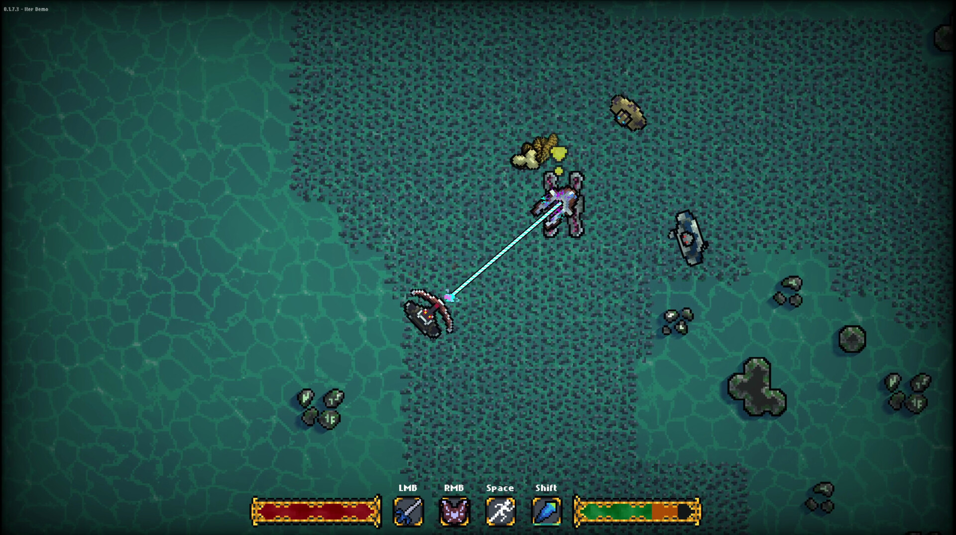 Iter is a real-time souls-inspired action-adventure game. Traverse dungeons, fight your way through a variety of enemies, and customize your loadout with weapons and abilities that you will find throughout the game.