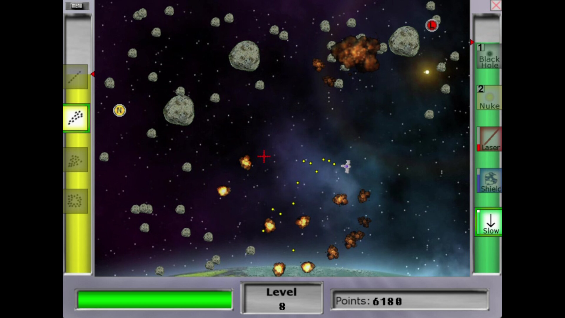 -Black Holes, Nukes, and the Laser are a great way to get rid of entire levels if you wish, but remember that you will not gain any additional power ups from meteors when these are used to destroy them!