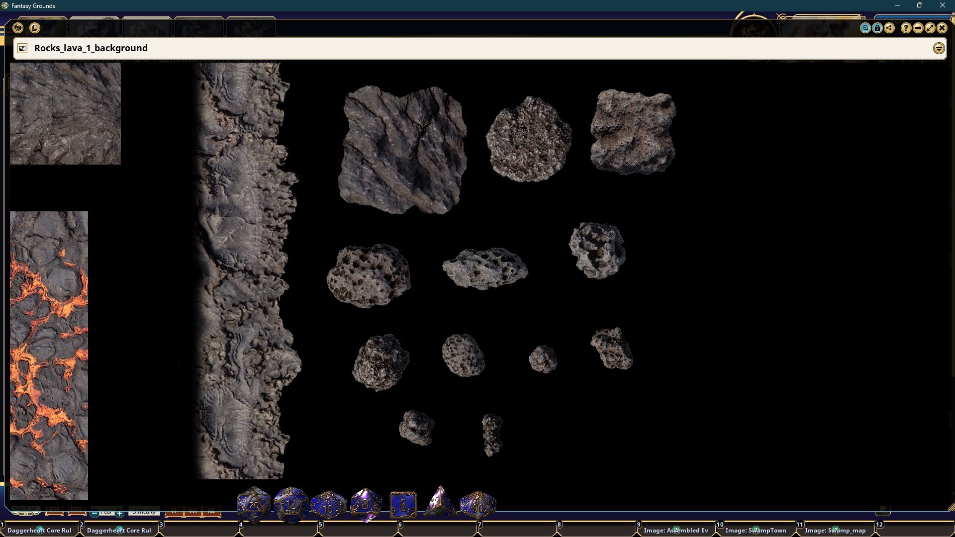 The FG Kingdoms Lava and Stone Map Pack features images and art produced by our in-house artist, Joshua Watmough. They have been organized and optimized for use with Fantasy Grounds VTT and the image tools. This art pack includes images for creating lava-filled environments. This pack consists of different lava textures, rock textures, rock decorations,and so on, to be collaged together to create custom and interesting locations. This pack includes the following items: