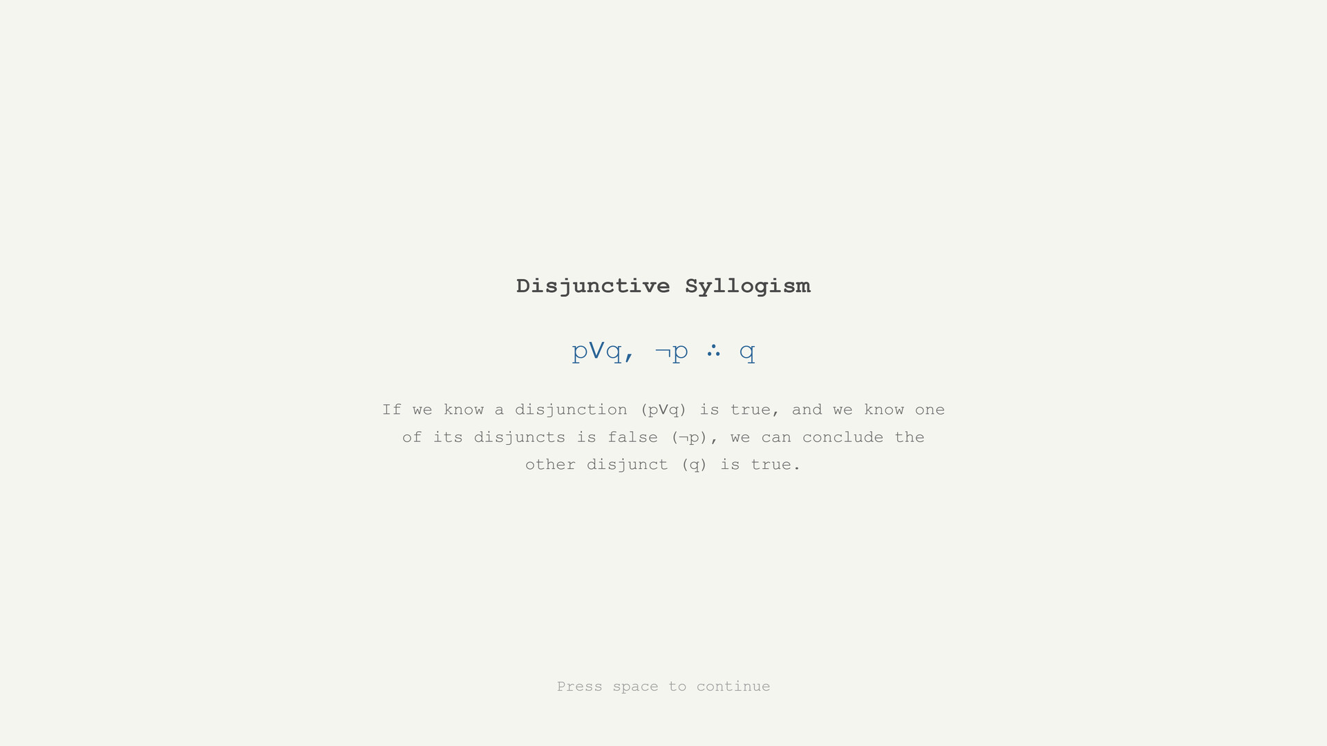 • 23 rules of logic — 7 rules of inference (Modus Ponens, Modus Tollens, Hypothetical Syllogism, and more), 11 rules of replacement (Double Negation, De Morgan's Laws, Transposition, and more), and 5 quantifier rules (Universal/Existential Instantiation and Generalization, Quantifier Negation)