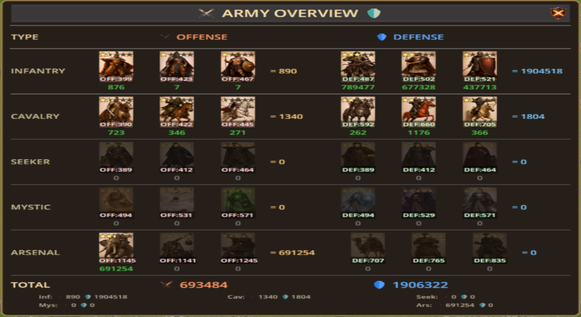 Train Infantry, Cavalry, Seekers, Mystics, and Arsenal units, each with strengths and counters. Master the counter cycle to crush your enemies.