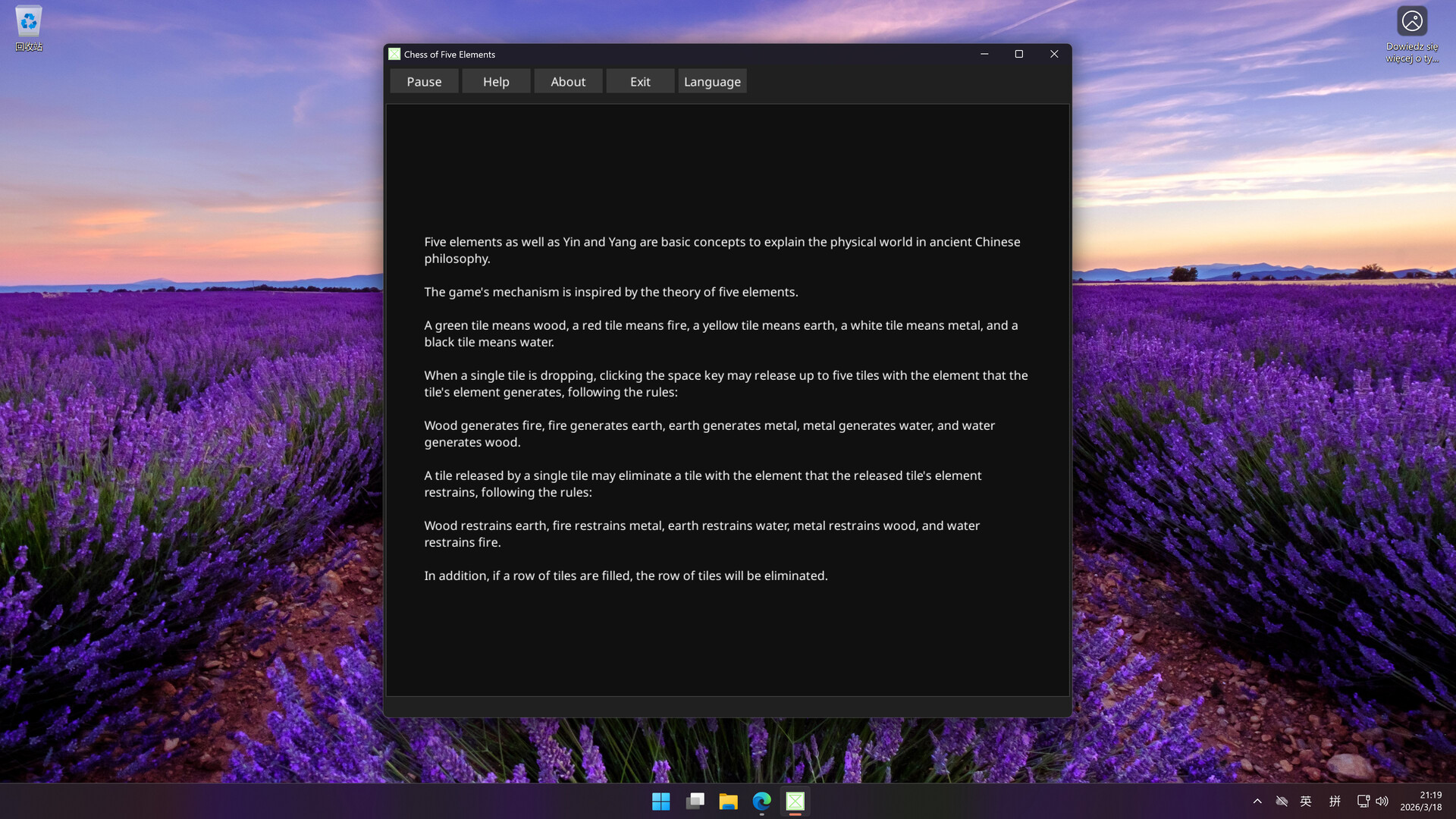 The mechanism of the game is inspired by the concepts of five elements from ancient Chinese philosophy. If you have known the relations of generating and restraining between elements, you may be familiar with the game soon.