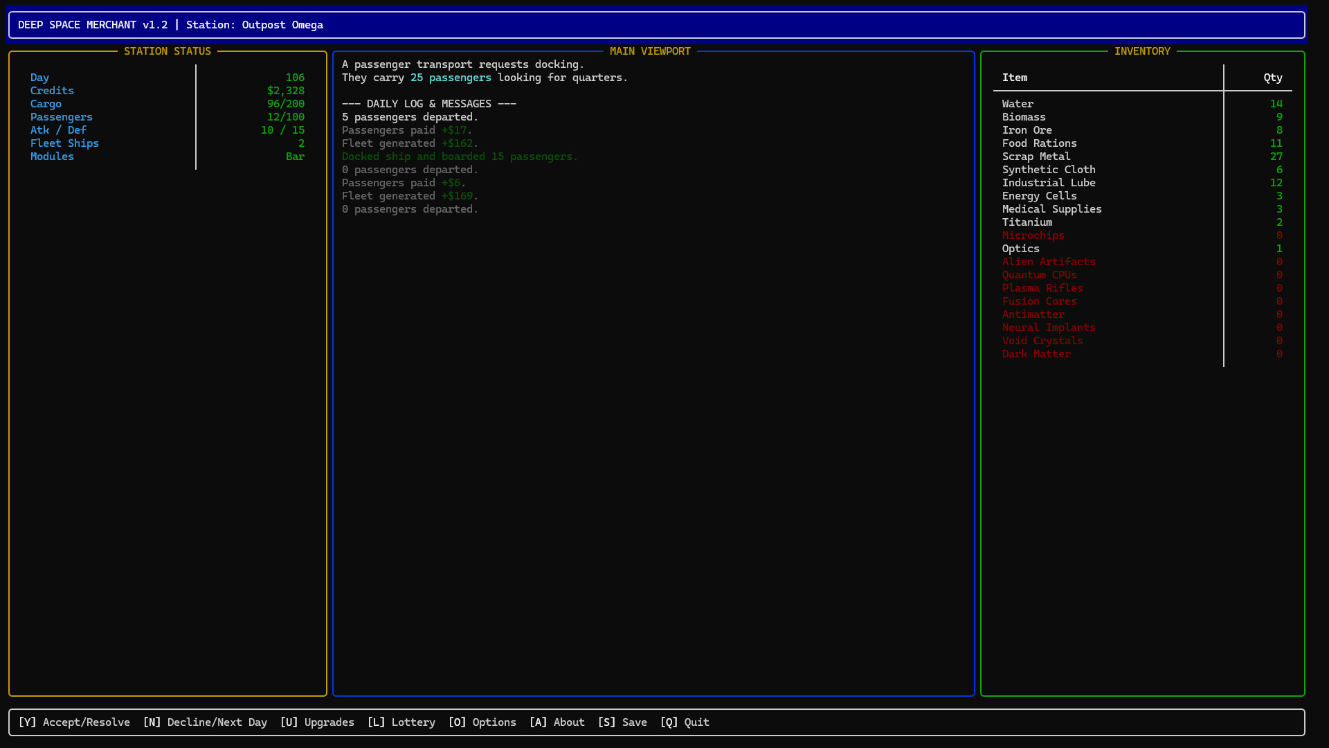 Deep Space Merchant is a highly addictive, pure-mechanics trading and management simulator with a retro, text-based terminal aesthetic. You are the newly appointed manager of an isolated space station. Every day brings new ships, volatile markets, and deadly risks. Your goal? Infinite profit and survival in the cold void.