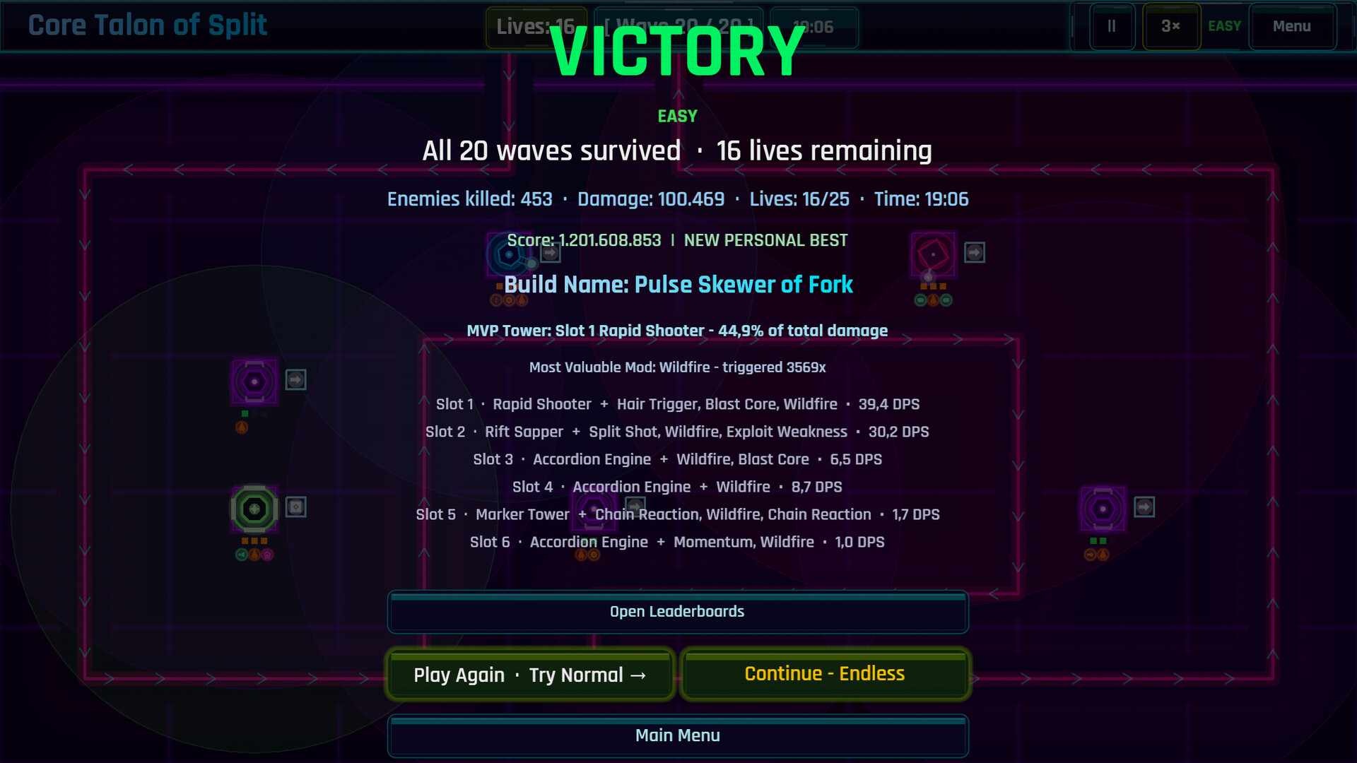Every wave, you get 1 choice: a new tower, a modifier, or an upgrade. Build a 6-slot machine across 20 waves, commit to your picks, and watch the wave play out. No panic micro. No filler choices. Just decisions that stack.
