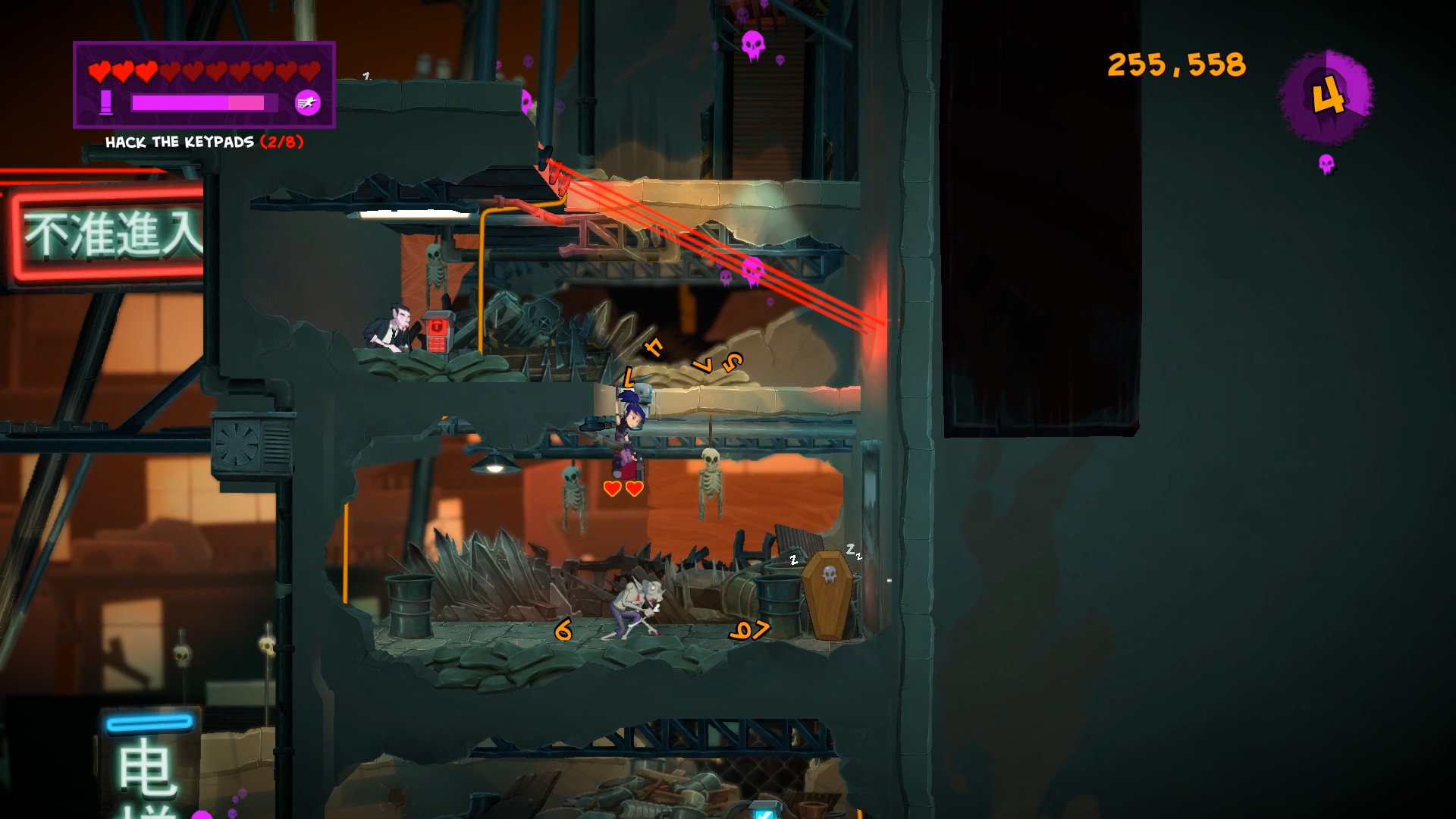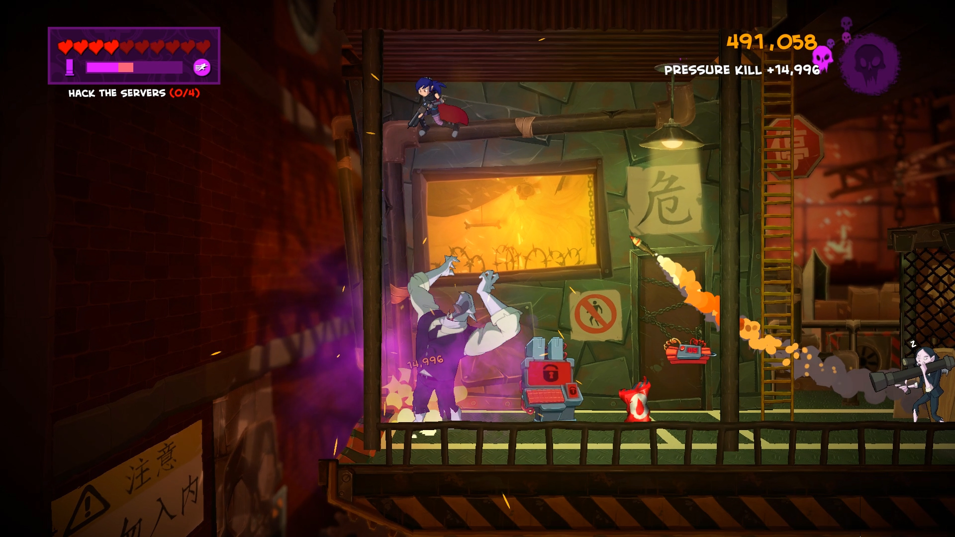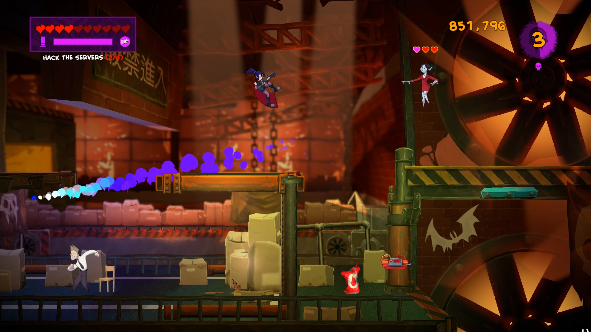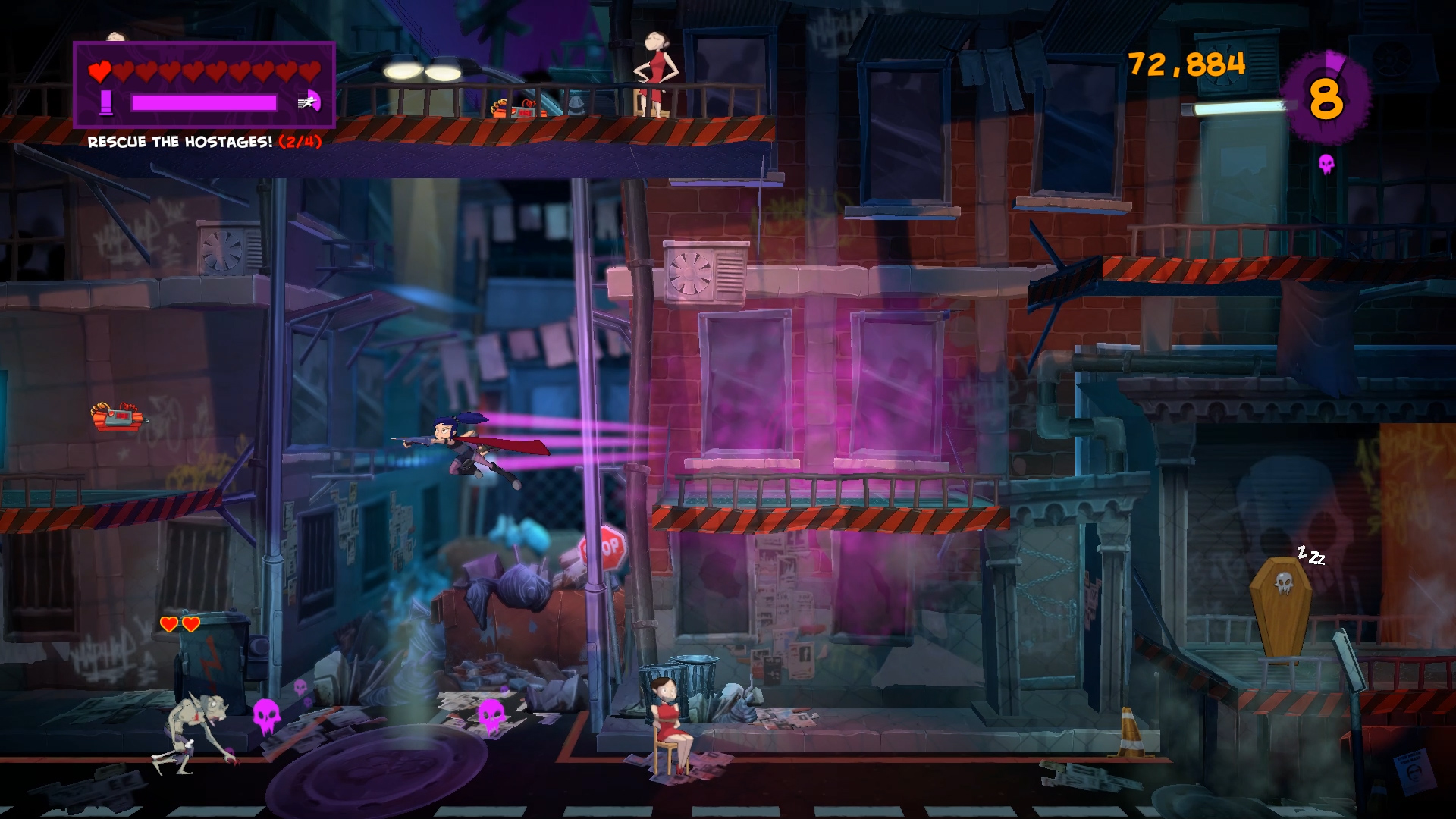 Cause distress in this challenging fast-paced action platformer. Experience a dark cartoon world come to life as frenetic gameplay meets comic book visuals and storytelling. Dash through beautiful arenas vanquishing vampires, rescuing hostages, disarming bombs, hacking servers and much more.