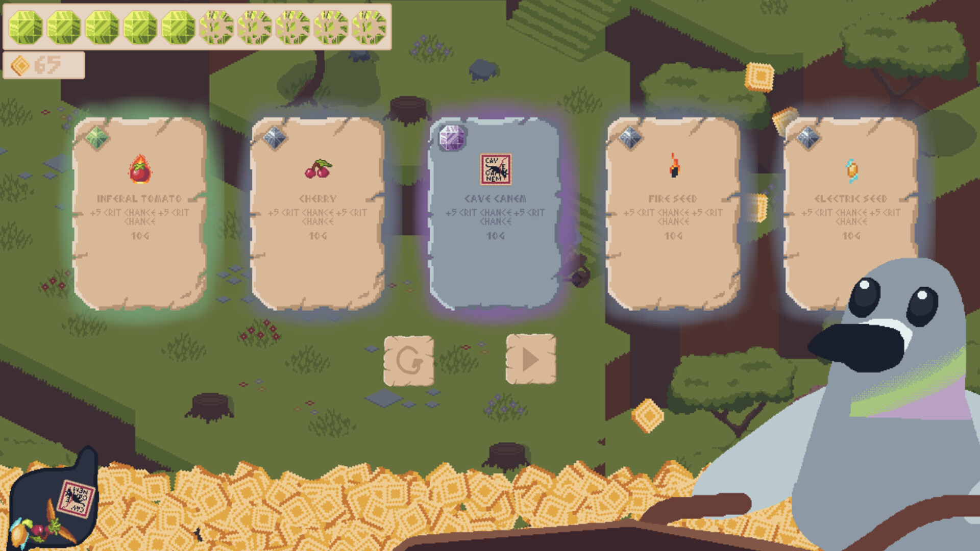 As one of the few survivors of a lost civilization of flightless birds, fight your way up the vulcano that wiped out your ancestors. Collect artifacts and find seeds to grow them into powerful crops to boost your stats.