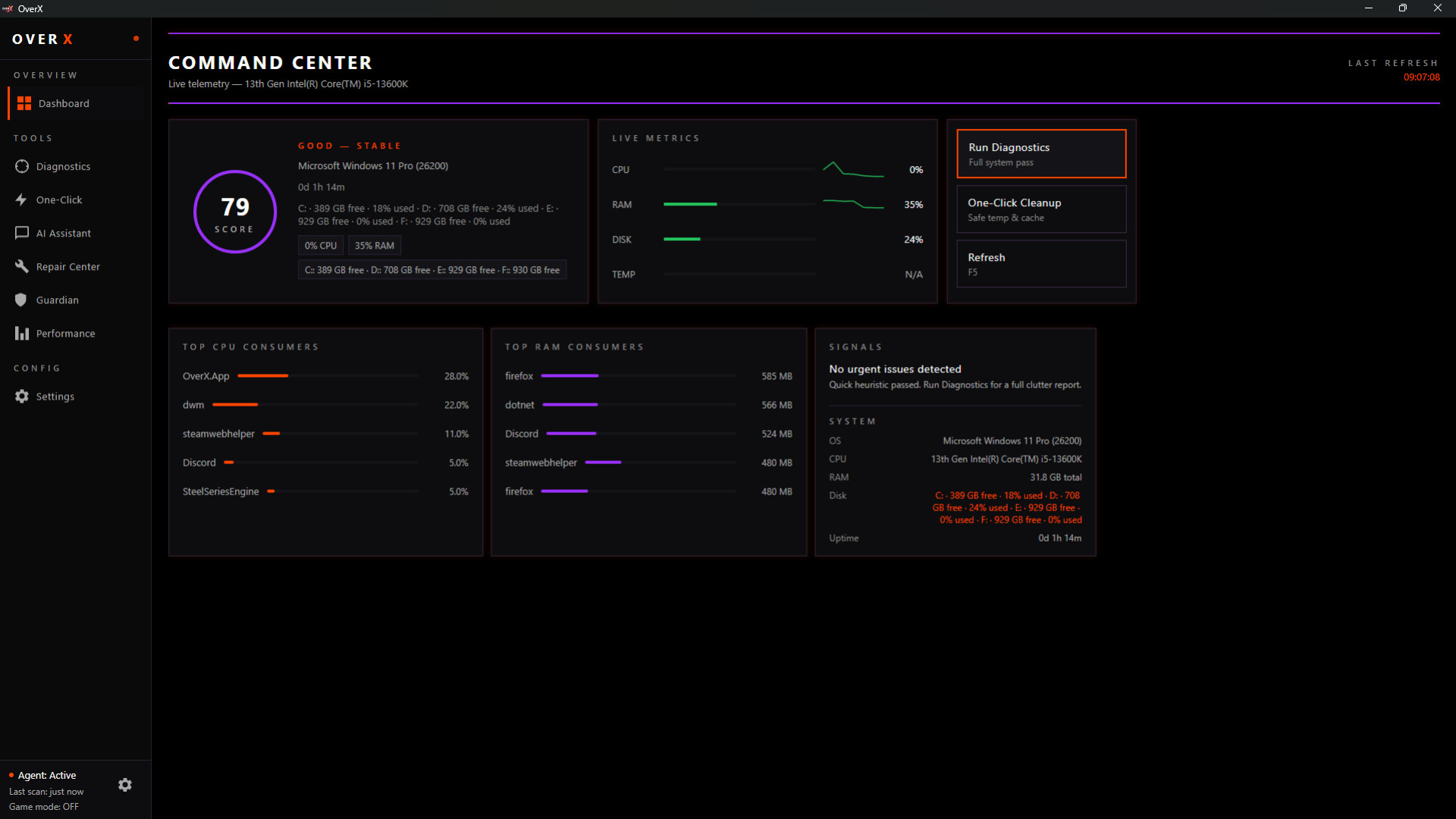 OverX is a lightweight system health assistant designed to help you monitor, understand, and improve your PC’s everyday performance.