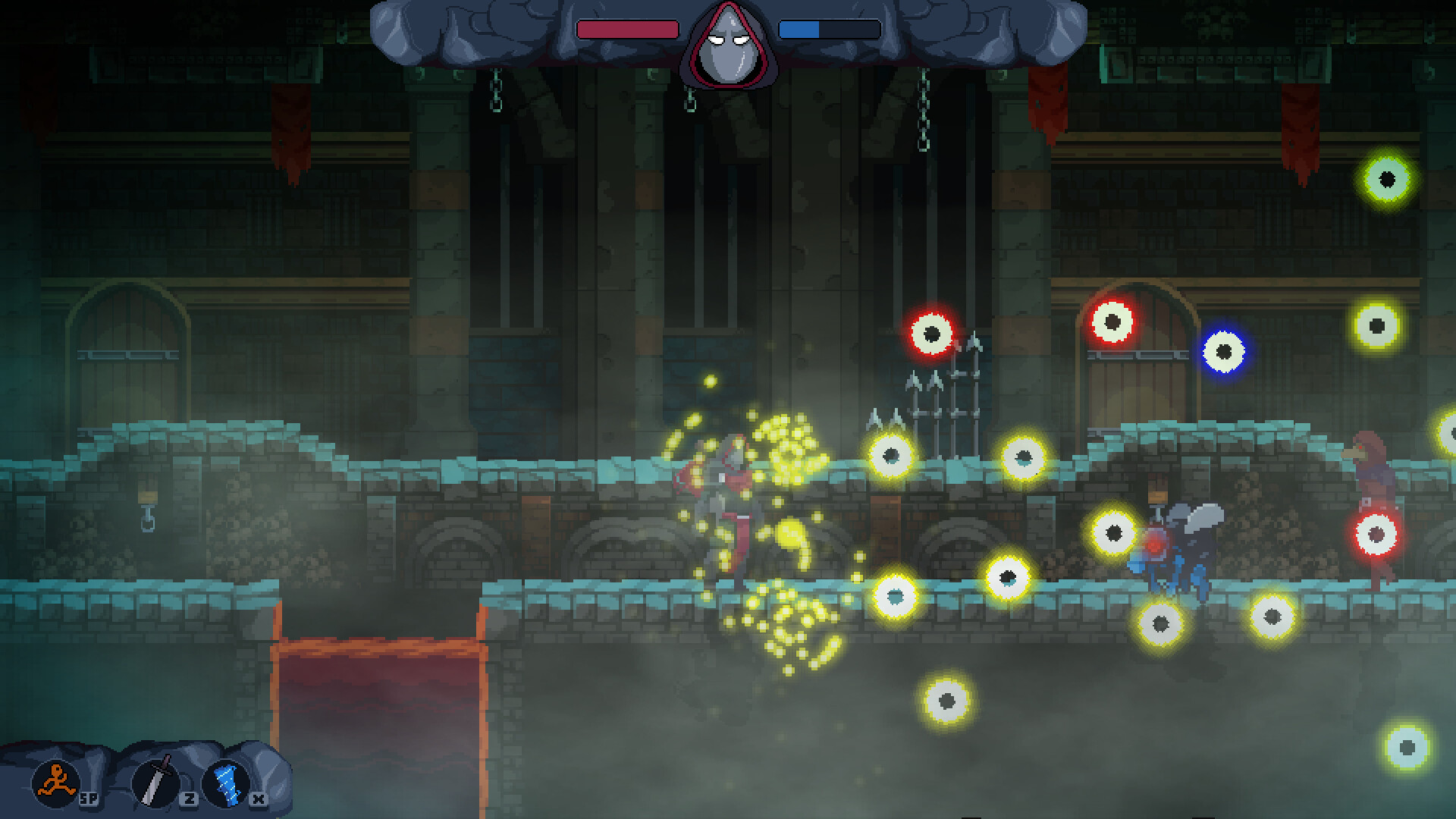 Night Creed is a 2D platformer. You control a character and move horizontally, fending off waves of enemies from both sides, both ground-based and flying. The player can use rolls to dodge attacks, use magic to destroy large groups of enemies, and collect life and mana orbs, which are needed to use magic. At the end of each wave, a boss appears—a unique enemy with a large amount of health and a unique attack pattern.