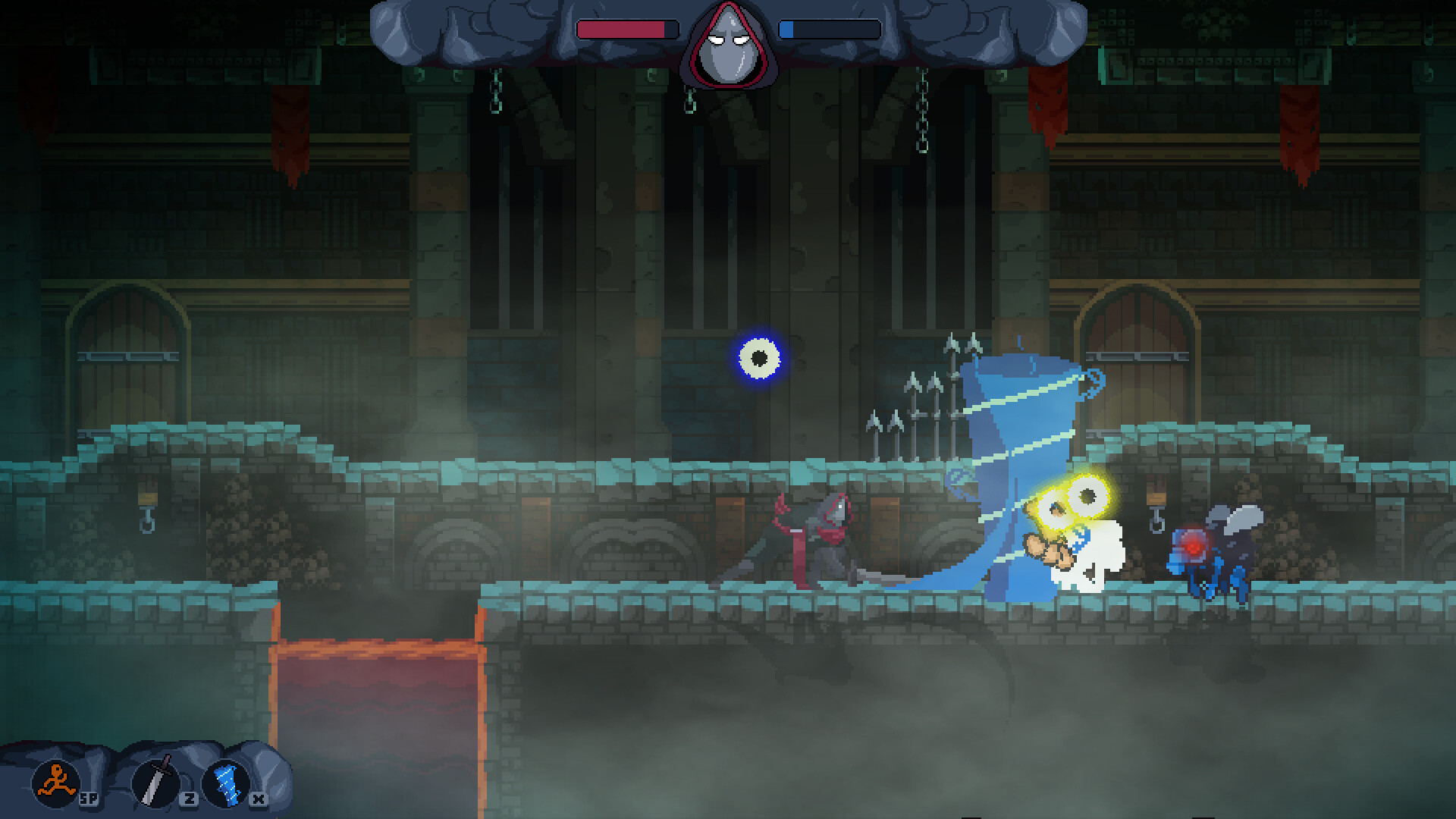 Night Creed is a 2D platformer. You control a character and move horizontally, fending off waves of enemies from both sides, both ground-based and flying. The player can use rolls to dodge attacks, use magic to destroy large groups of enemies, and collect life and mana orbs, which are needed to use magic. At the end of each wave, a boss appears—a unique enemy with a large amount of health and a unique attack pattern.