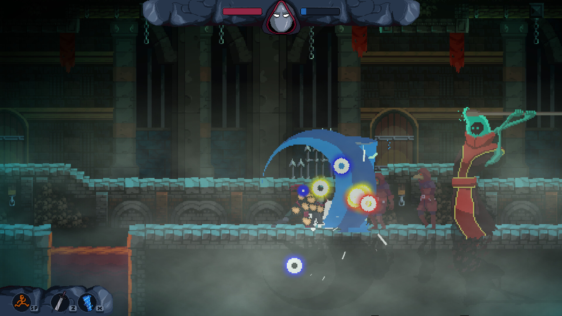 Night Creed is a 2D platformer. You control a character and move horizontally, fending off waves of enemies from both sides, both ground-based and flying. The player can use rolls to dodge attacks, use magic to destroy large groups of enemies, and collect life and mana orbs, which are needed to use magic. At the end of each wave, a boss appears—a unique enemy with a large amount of health and a unique attack pattern.