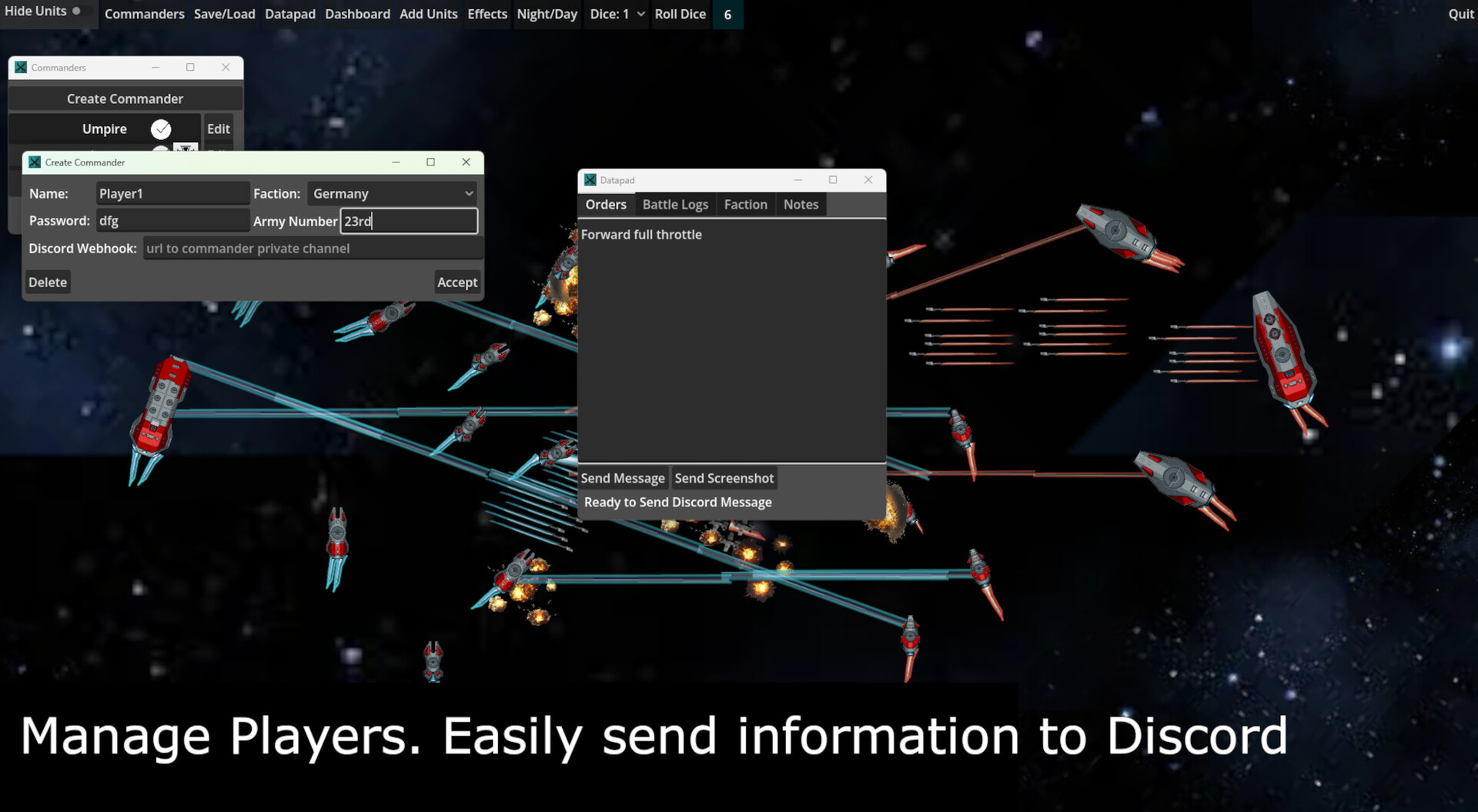 • Logins. Give your players a name and password then share the save file. They'll be able to login as their commander and will only see what they're allowed to see.