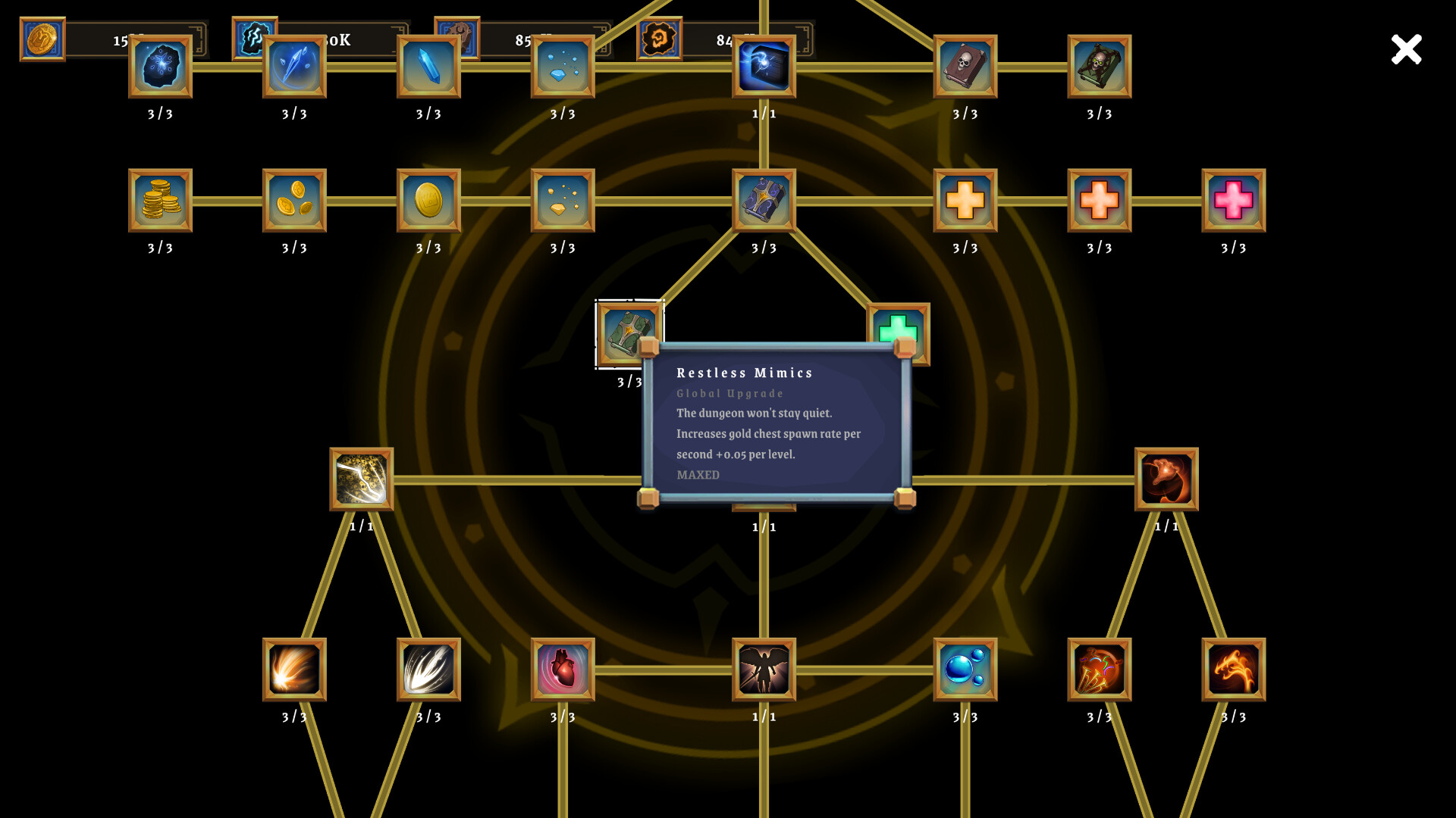 Play as 4 auto-running heroes (Warrior, Rogue, Mage, Cleric) in tiered dungeon runs. Open chests for currencies while curse damage ramps over time; clear tiers, then spend earnings at camp on a branching upgrade tree. Demo: tiers 1-5 plus a sample of meta upgrades from the full skill web.