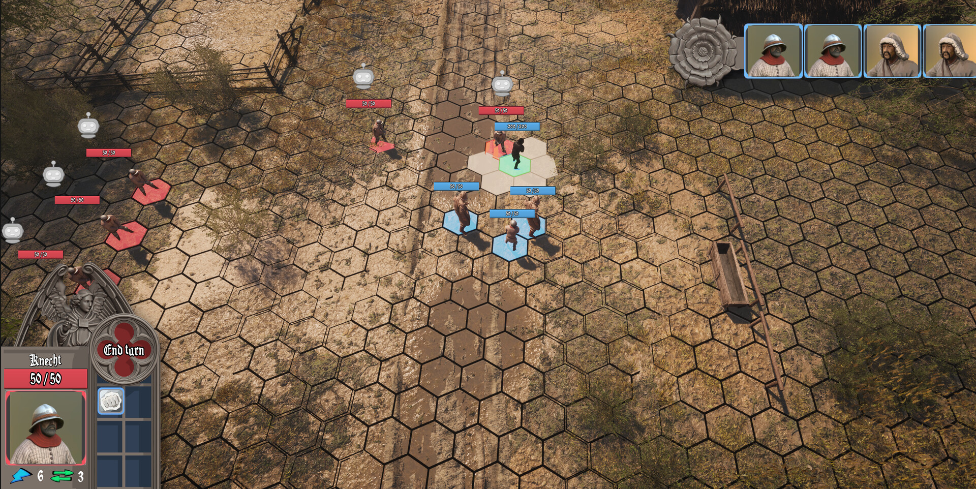 De Profundis 1454 is a turn-based tactical game, set in the first year of the war between the Teutonic Order and the Kingdom of Poland. As a player, you lead a group of simple civilians- outcasts, who are trying to survive in the area of ​​​​several armies, each of which uses scorched earth tactics.