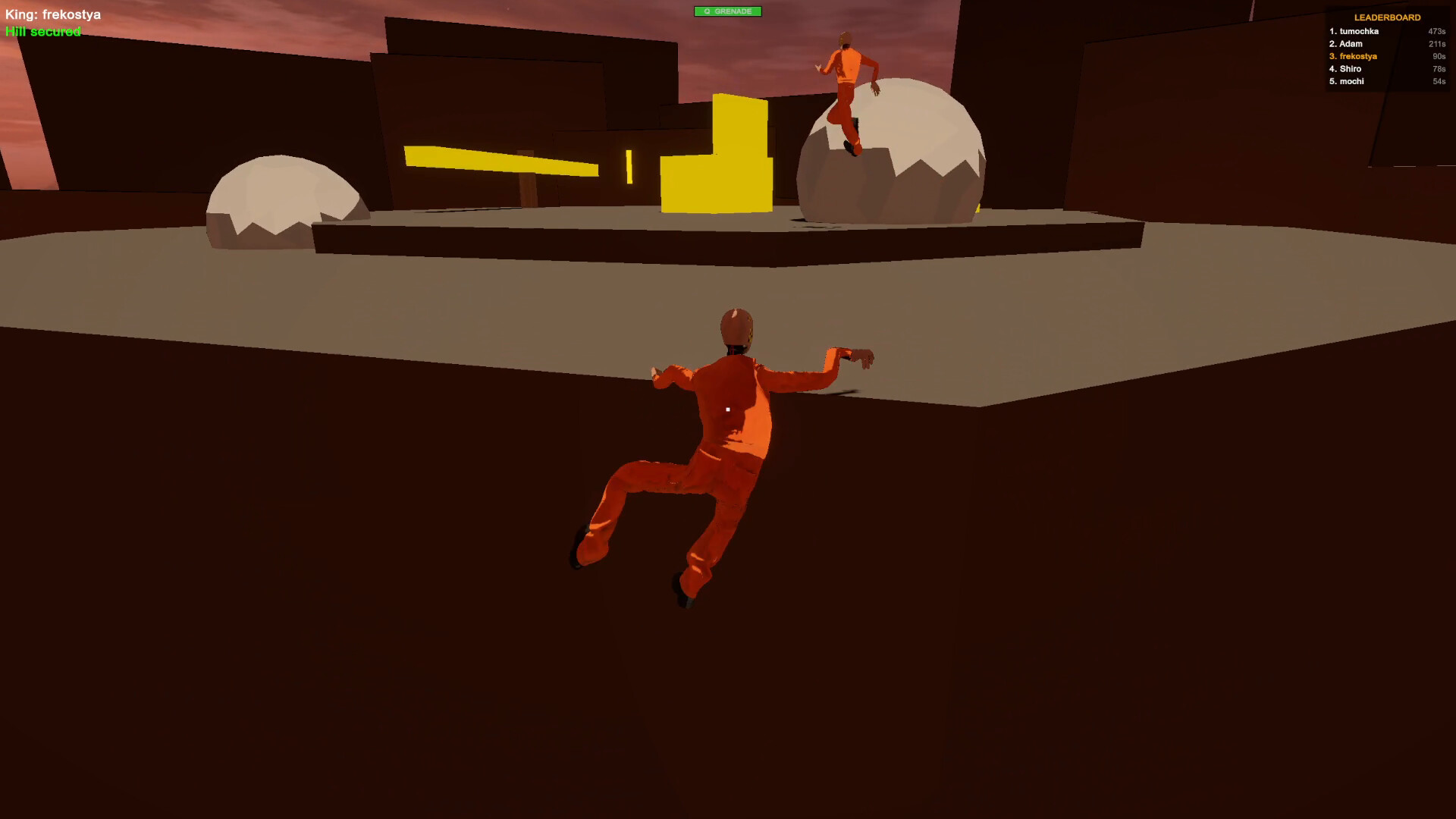 「The game features online multiplayer King of the Hill mode with physics-driven combat, multiple weapons (bazooka, grenades, grappling hook), grab and throw mechanics, wall climbing, and a volcanic arena. The core gameplay loop is fully playable.」