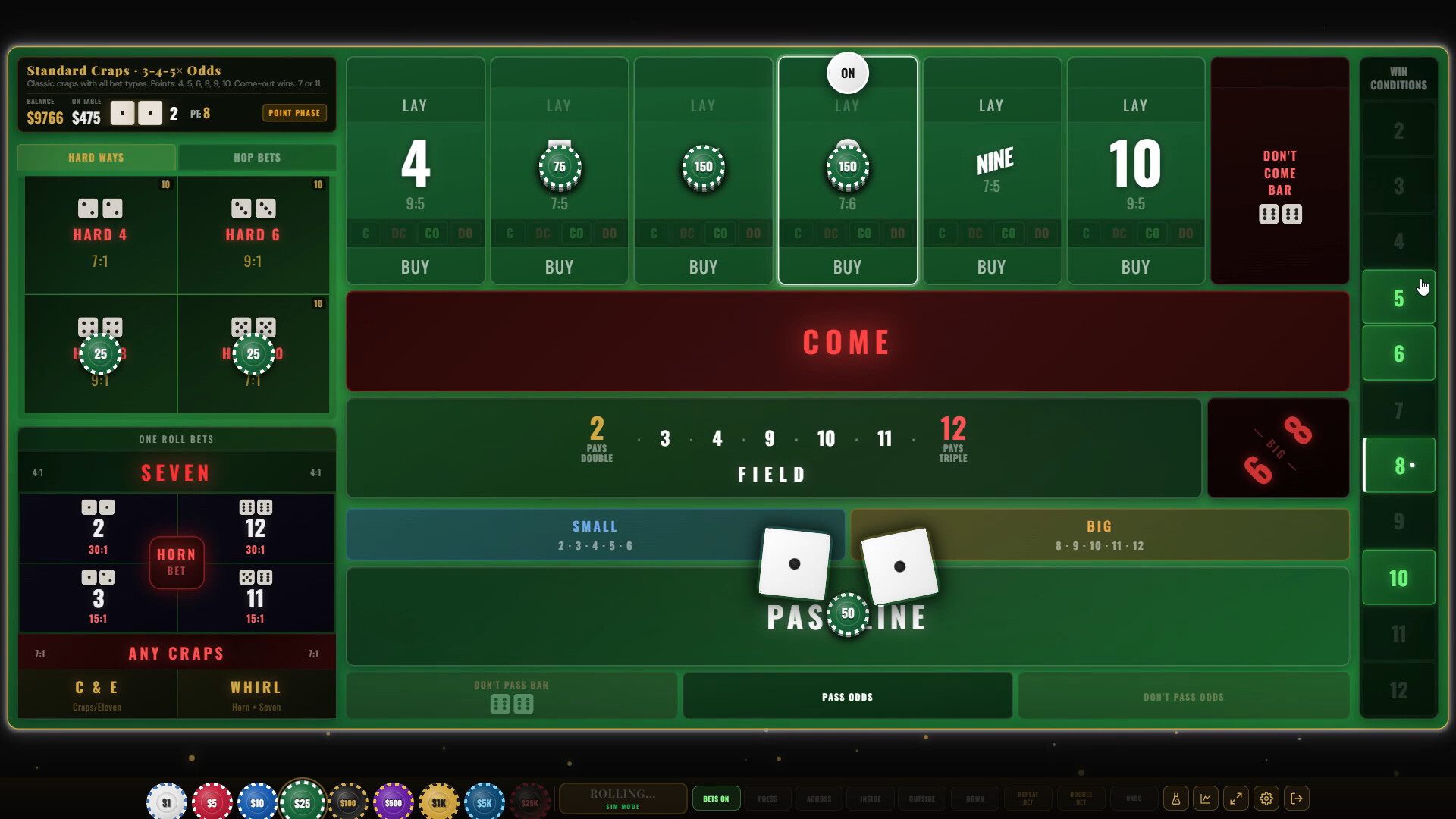 Table Conditions — Simulate the streaks that every craps player talks about. Cold table? The 7 shows up almost every other roll. Hot table? The shooter goes on a 30-roll run and the 7 practically disappears. Study what those streaks actually do to your bankroll instead of just telling stories about them.