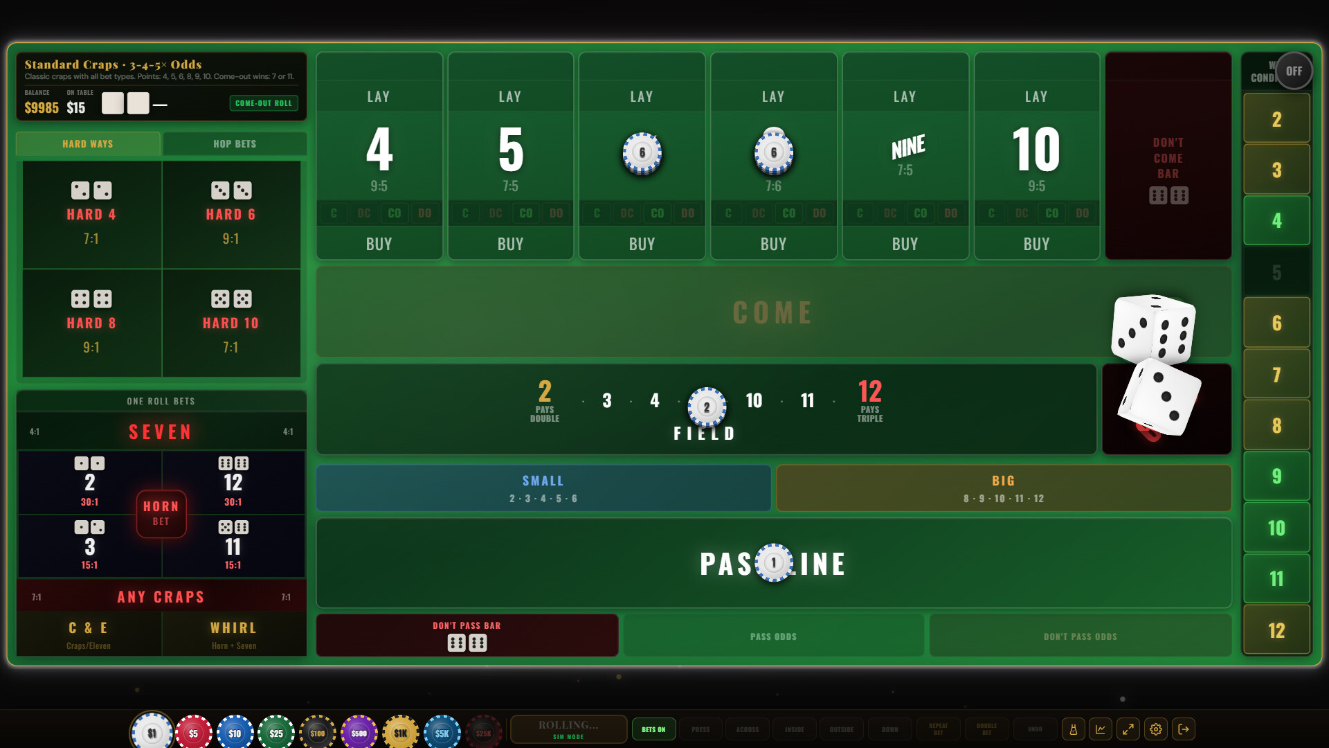 Easy Craps — Simplified rules with Low Field and High Field bets. No Come, Buy, or Lay. Perfect for learning, surprisingly deep once you understand it.