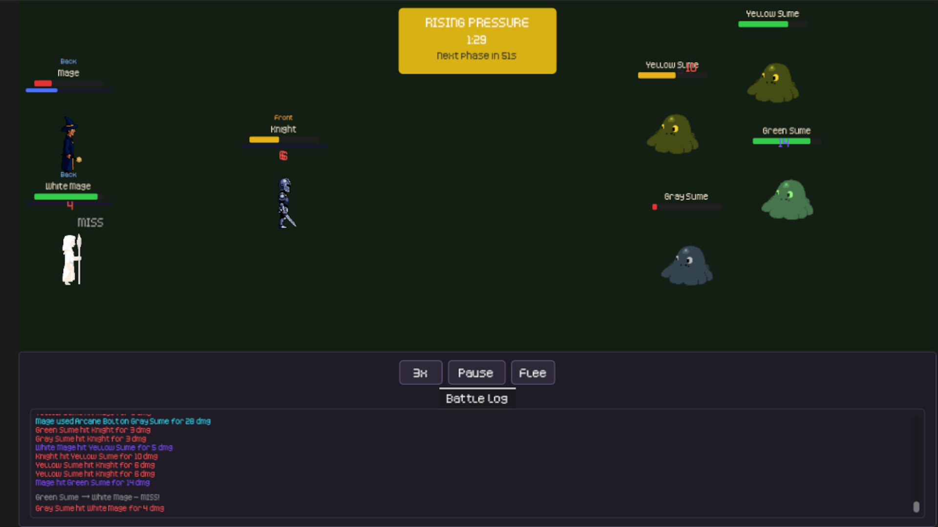 Combat runs in real time. Watch ability cooldowns tick, damage numbers fly, and your White Mage race to keep the party alive. Speed up, pause, or let it run.