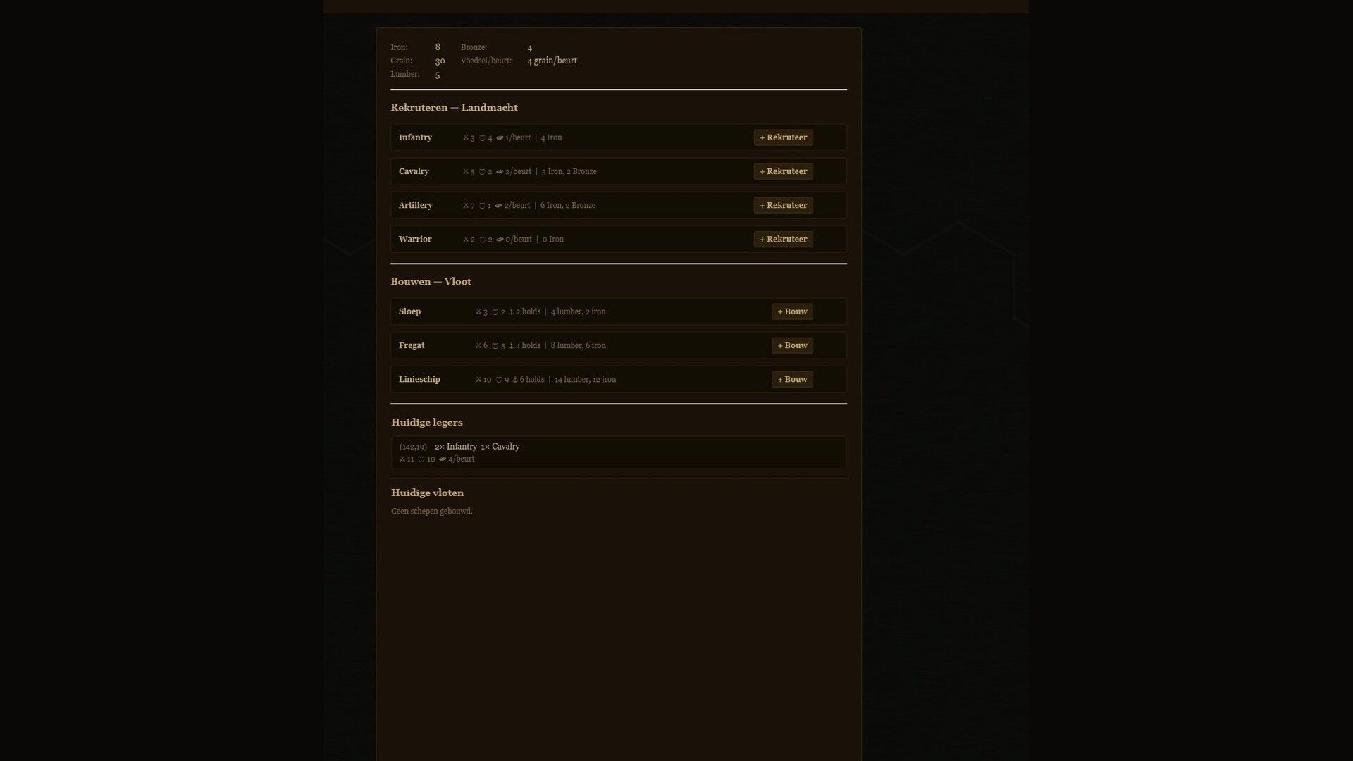 Raw materials alone don't build empires. Convert Timber into Lumber, Iron Ore into Iron, Wool into Fabric — and combine them into Bronze, Paper and more. Your production runs on labor: hire workers and assign them to manufacturing batches each turn. Balance your workforce carefully. Too little food and your workers go unfed. Too little iron and your army goes unequipped.
