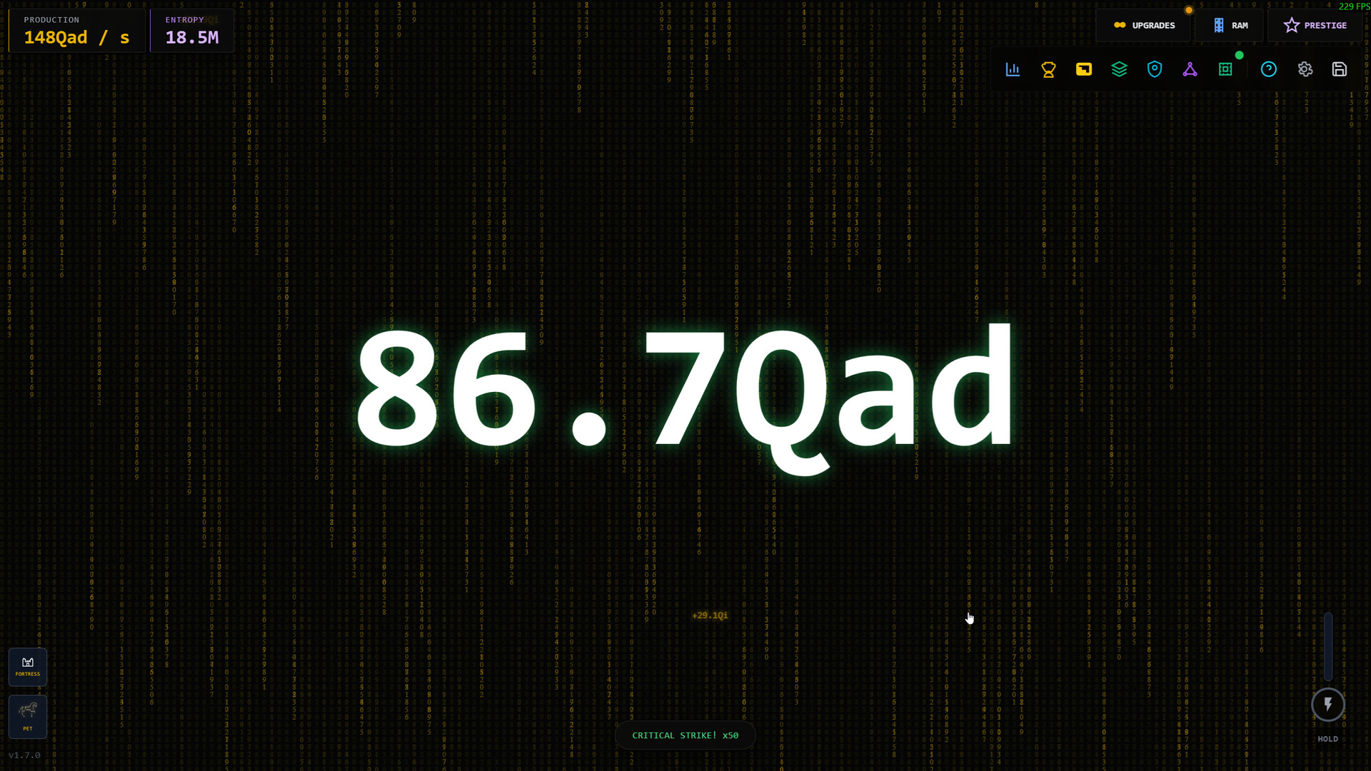 When progress slows, reset your run to gain Entropy—a prestige currency that unlocks permanent upgrades. Each prestige grants increasing bonuses, and you can spend Entropy on powerful upgrades like: