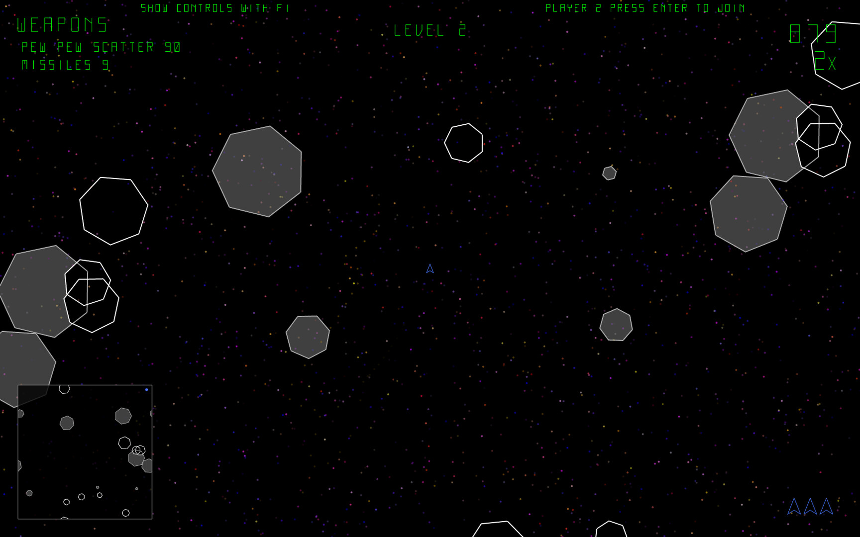 Newtonia is a 2D top-down space shooter. It features local split-screen PvP or PvE. Pick up new weapons and destroy all the asteroids, progressing through the levels. Try and beat your own high score.