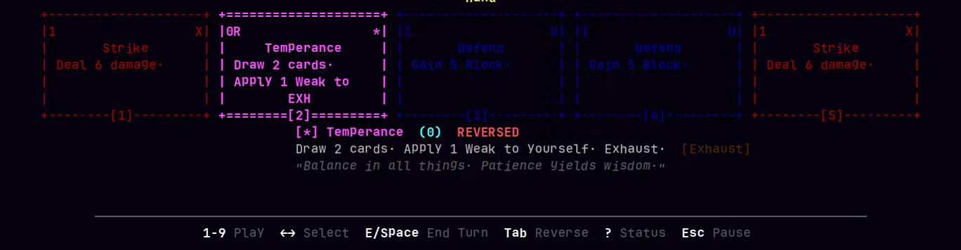 A simple tarot-themed, ASCII style roguelike deckbuilder with a unique twist! Play cards upright or flipped for power at a cost. Build synergies across seven suits, collect 87 relics, and fight through three acts as one of five unlockable characters. Every run reshuffles the journey!