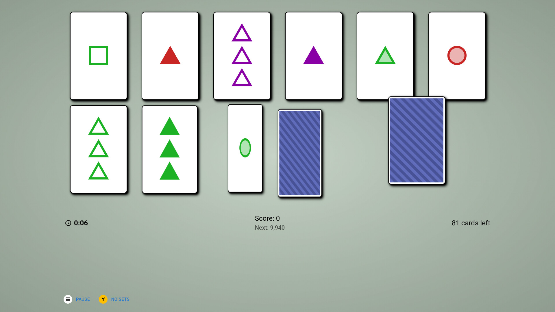 • Core Set-Finding Gameplay — Scan a layout of 12 face-up cards, each defined by four attributes: Color (Red/Green/Blue), Symbol (Triangle/Circle/Square), Count (1/2/3), and Shading (Solid/Striped/Empty). Find sets of exactly three cards where each attribute is either all the same or all completely different — then watch them disappear and new cards deal in.