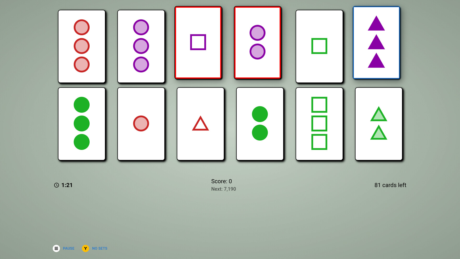• Combo Chains & Bonuses — Chain multiple sets in rapid succession for escalating multipliers and massive score boosts that make every hot streak feel exhilarating. Correctly identifying that no set exists keeps the combo going.
