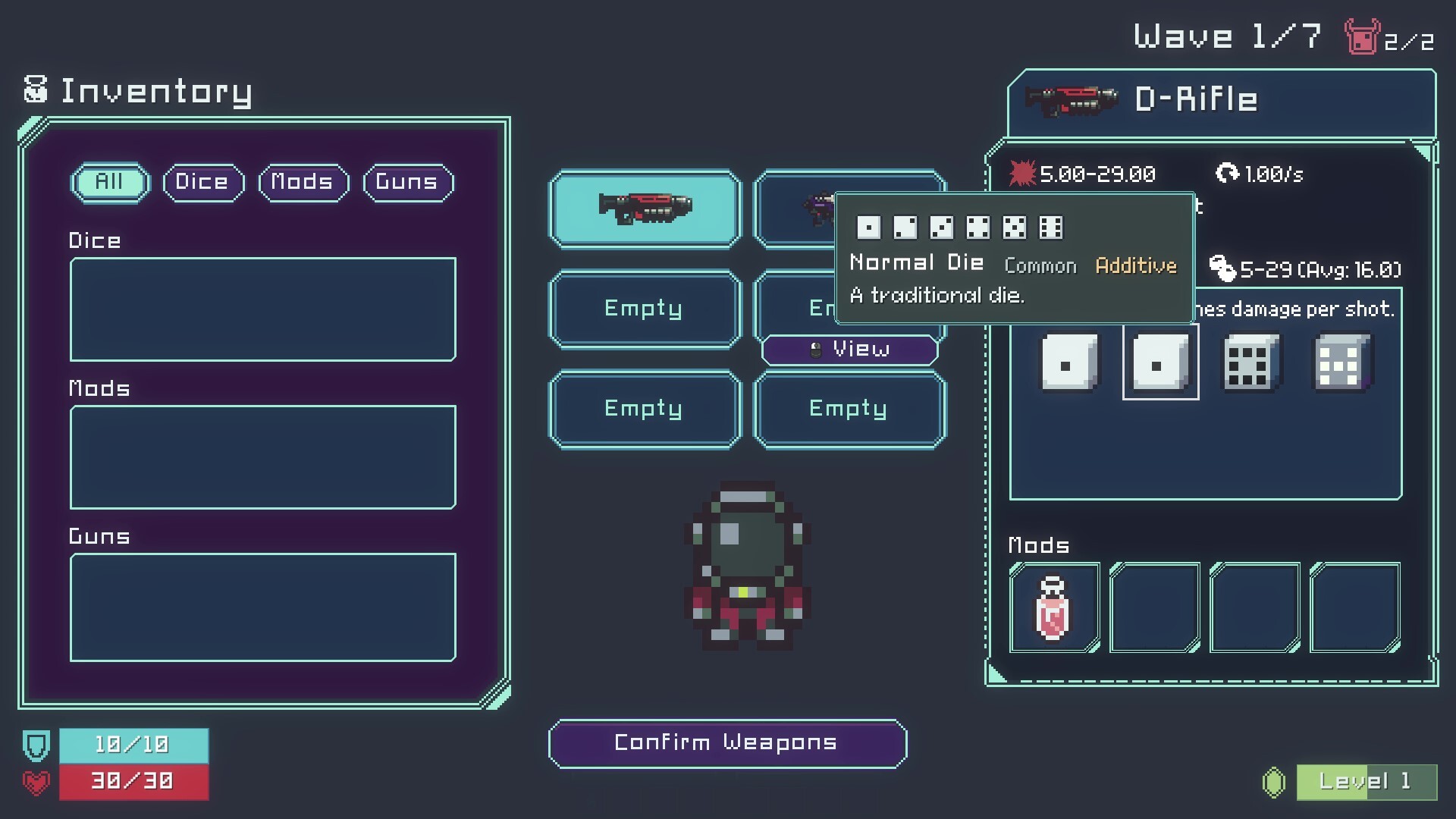 Guns roll dice. Dice trigger mods. Mods cause MAYHEM! Save the world from invading cosmic horrors by building crazy synergies with dice-driven weaponry.