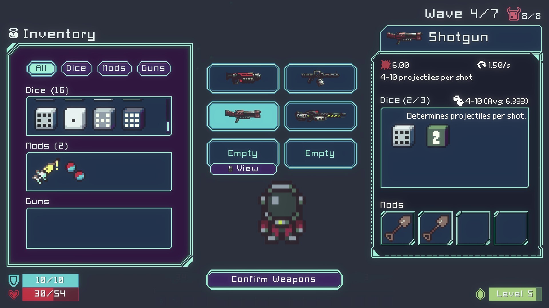 • Crazy synergies from combining the effects of your guns, dice, and mods