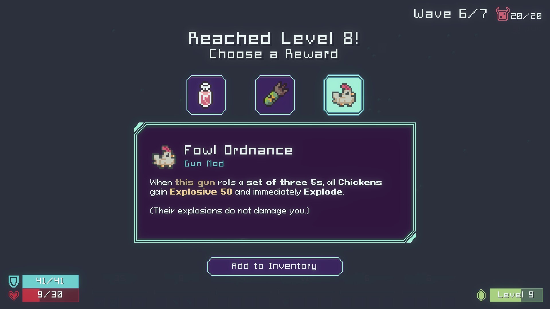 Equip your guns with a wide assortment of dice and mods to modify how they work, from applying knockback to spewing poisonous gas to turning mobs into exploding chickens*. Survive waves of cosmic horrors and fight off the Chaos Lord himself to save our planet! (And the universe, probably.)