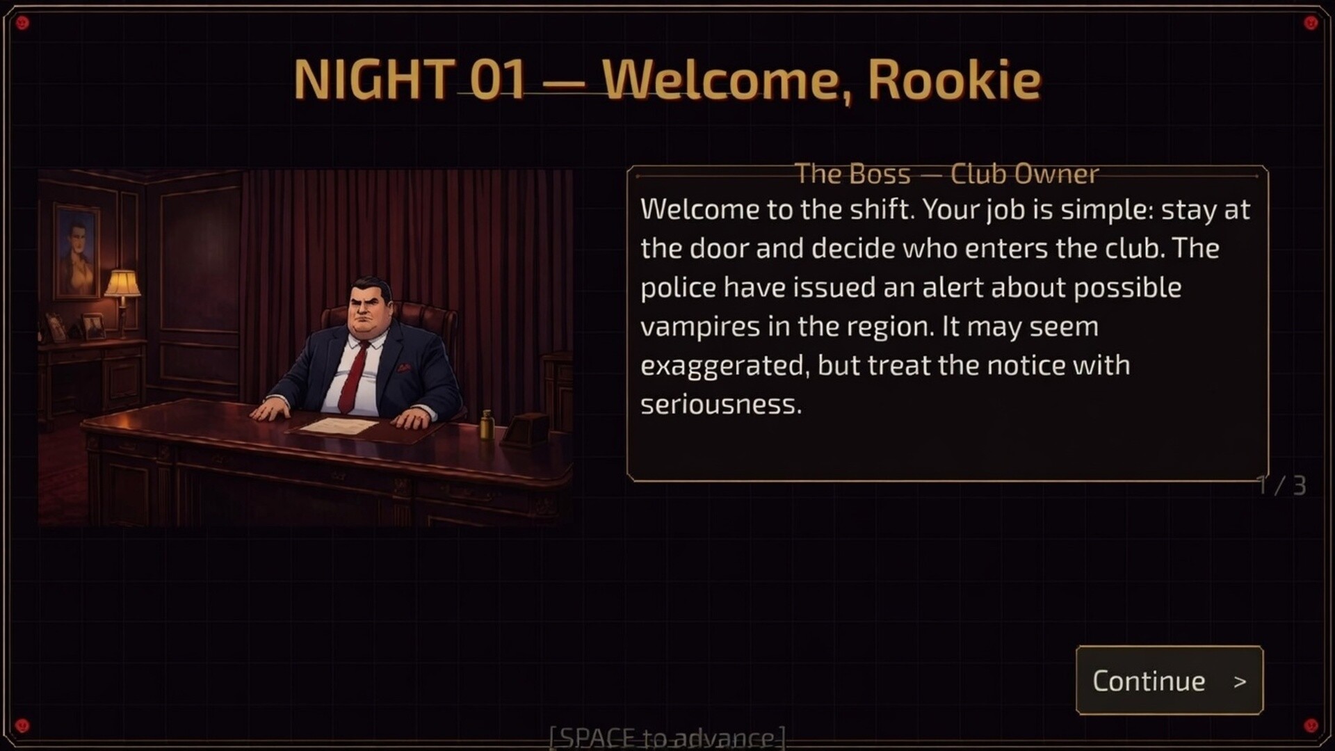 Vampires infiltrate the nightclub queue. You are the bouncer. Check documents, observe suspicious behavior, and use tools to decide who gets in and who stays outside, but the final decision is always yours.