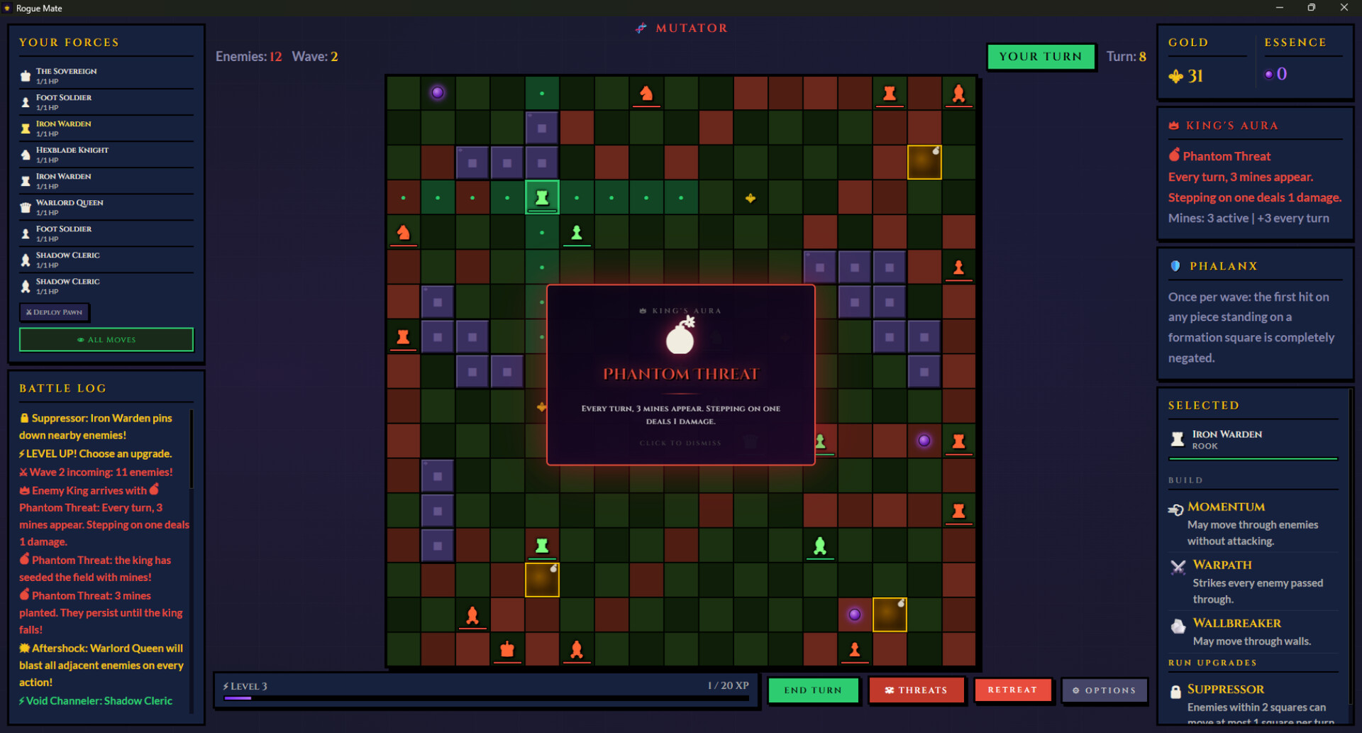 A roguelite chess RPG where your pieces evolve beyond the board. Unlock branching skill trees, recruit and build your warband, then battle through ten handcrafted boss encounters, each with unique mechanics designed to dismantle your strategy.